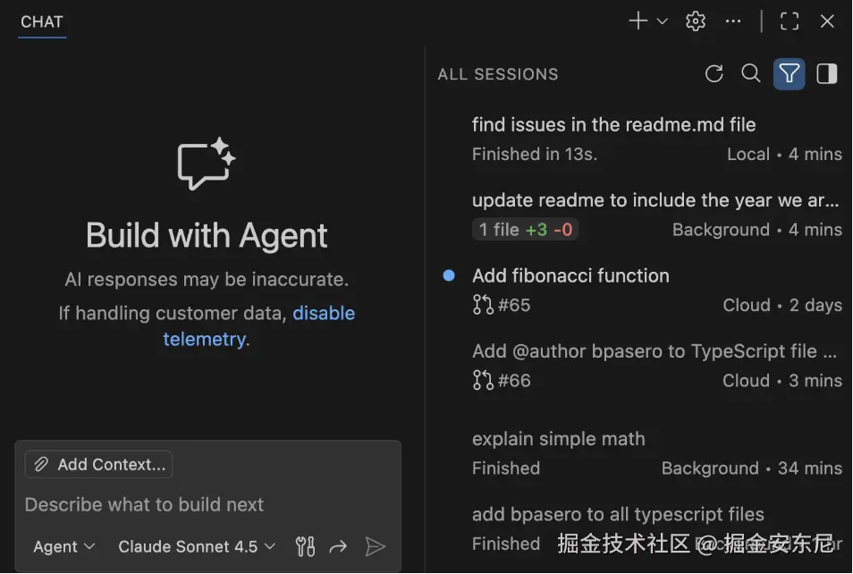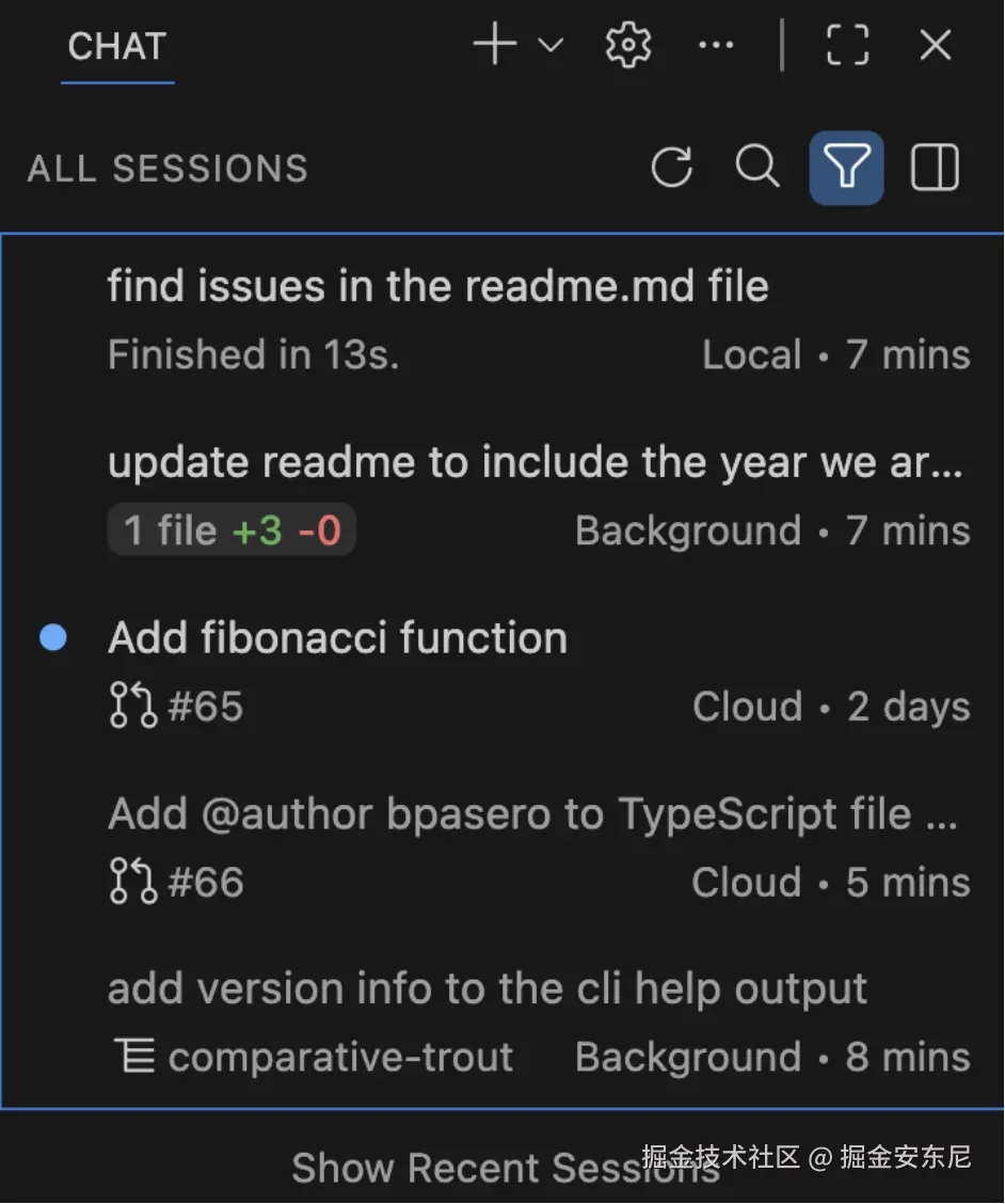 在本次迭代中,我们将 Agent 会话直接整合进 Chat 视图,提供统一的使用体验。你可以一眼看到会话状态、进度以及文件变更统计信息,也可以对会话进行归档或取消归档,以保持列表整洁。
