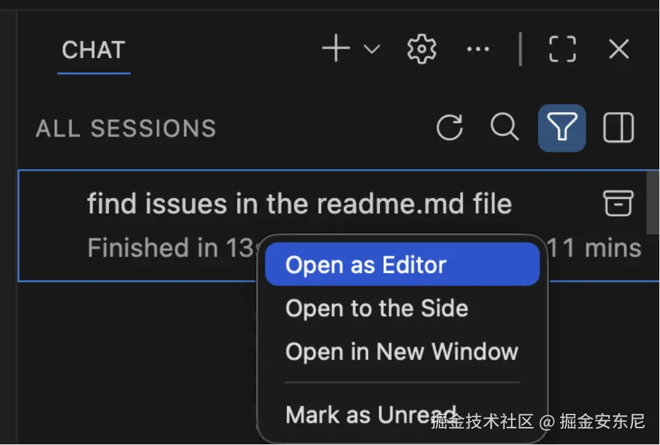 点击会话后,它会在侧边栏的 Chat 视图中打开,展示完整的对话历史。你也可以将会话作为编辑器标签页或在新窗口中打开。右键会话即可看到这些选项。