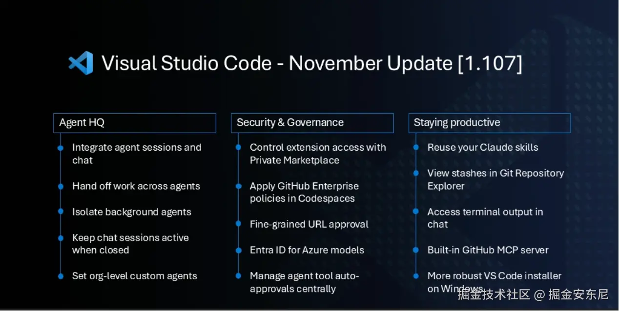 VS Code 1.107 引入了多智能体编排(multi-agent orchestration) ------你可以将 GitHub Copilot 与自定义 Agent 结合使用,加速并行开发。