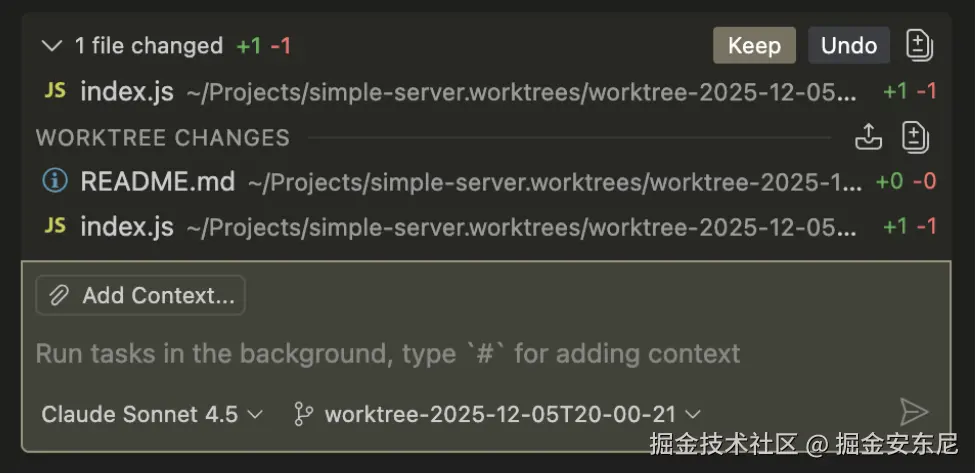 现在,你可以选择让后台 Agent 运行在独立的 Git worktree 中。系统会自动为该会话创建新的 worktree,将修改隔离在独立目录下,任务完成后你可以轻松审查并合并改动,甚至直接一键应用到主工作区。