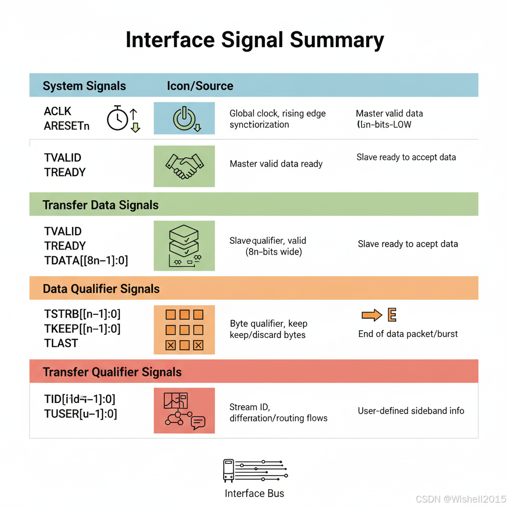 - TUSER (主机 Master 发出): 用户定义信号。这是一个"万能"的侧带信号,协议没有规定具体用途,用户可以利用它传输任何自定义的辅助信息。