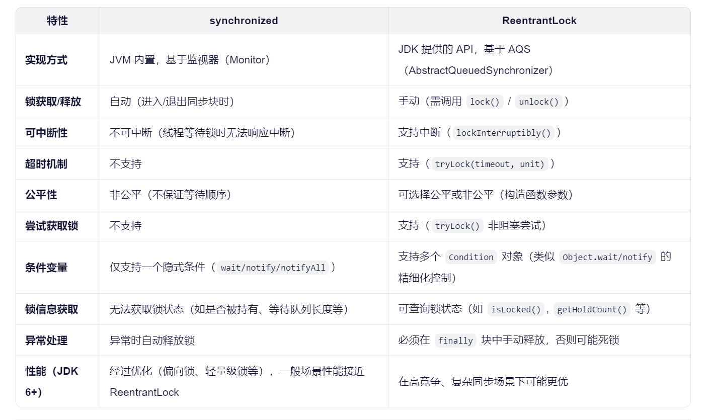 ReentrantLock时,必须确保unlock()在finally块中调用,否则异常可能导致死锁。 synchronized在早期版本性能较差,但在 JDK 6 之后通过锁优化(偏向锁、轻量级锁、自旋锁等)大幅改善。ReentrantLock是可重入的,和synchronized一样,同一个线程可以多次获取同一把锁。