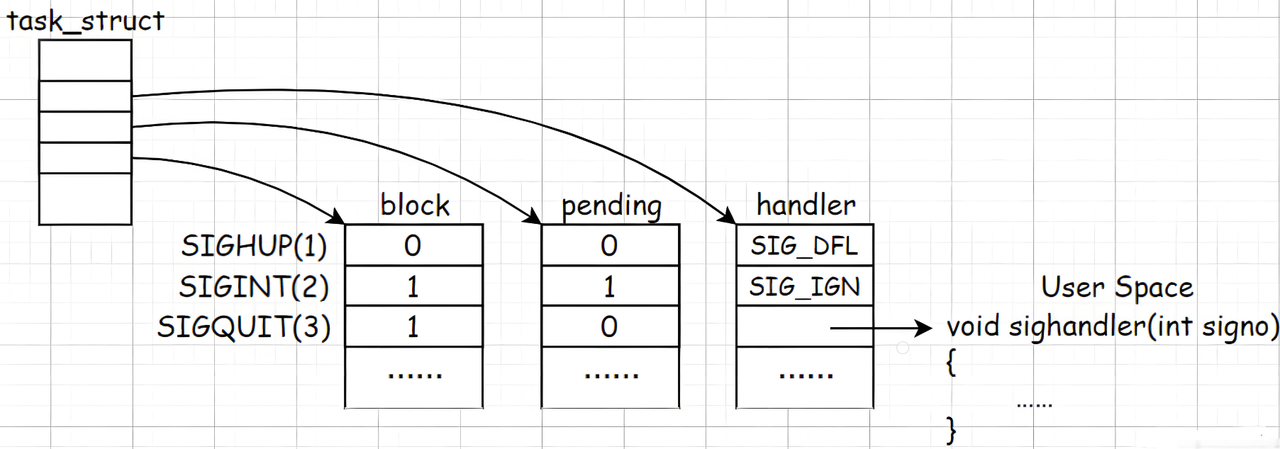 1表示 "该信号已产生但未处理(因被阻塞)",0表示 "未产生或已处理"handler(记录的是信号的处理方法):
