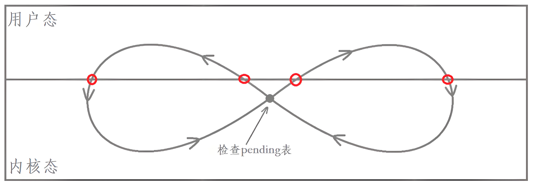 - 内核处理请求时,会检查 pending 表(记录待处理的中断 / 事件),处理完后再从 "内核态" 切回 "用户态"(向上的箭头)。