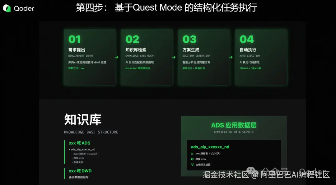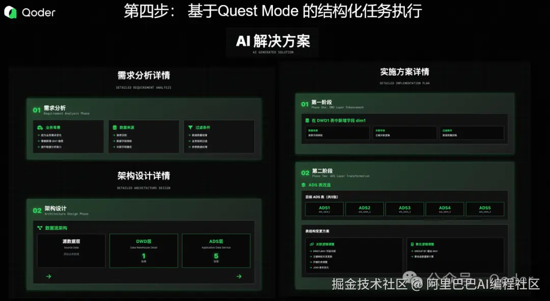 在完成数据仓库搭建后,我收到为某业务域新增维度的需求。通过Qoder的Quest Mode,系统首先自动检索知识库中与该域相关的ADS表(指标表)和DWD表(数据仓库明细层),并清晰标注血缘关系。随后生成的实施方案包含三个核心模块: