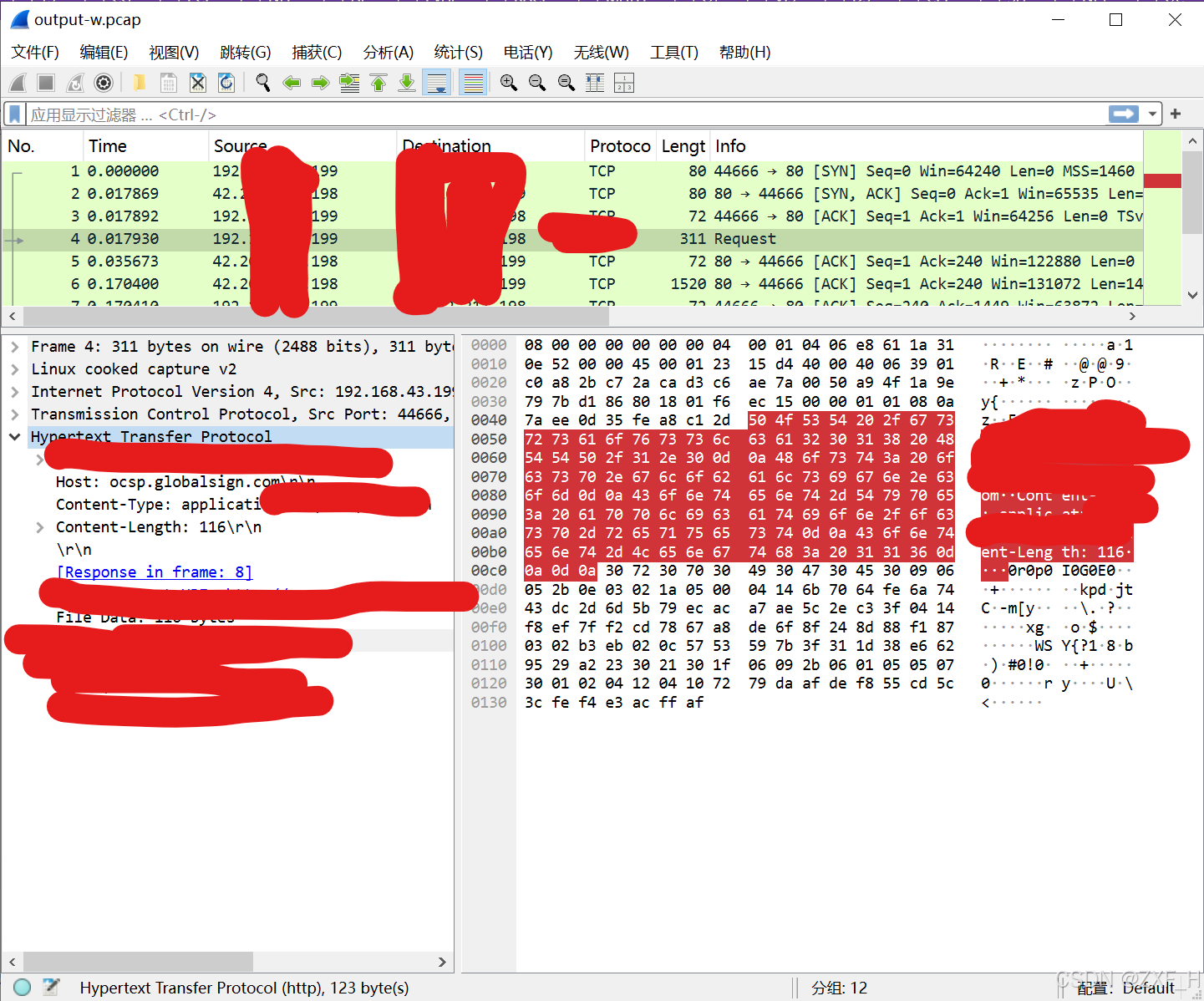 -i any表示监听所有网络接口,-w output.pcap指定输出文件名为output.pcap,port 80 or port 443表示只捕获到80端口(HTTP)和443端口(HTTPS)的数据包。 -