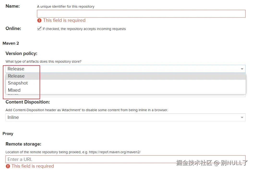 创建proxy仓库页面如下:主要配置就是仓库名称name,版本策略version policy和远程仓库地址remmote storage。