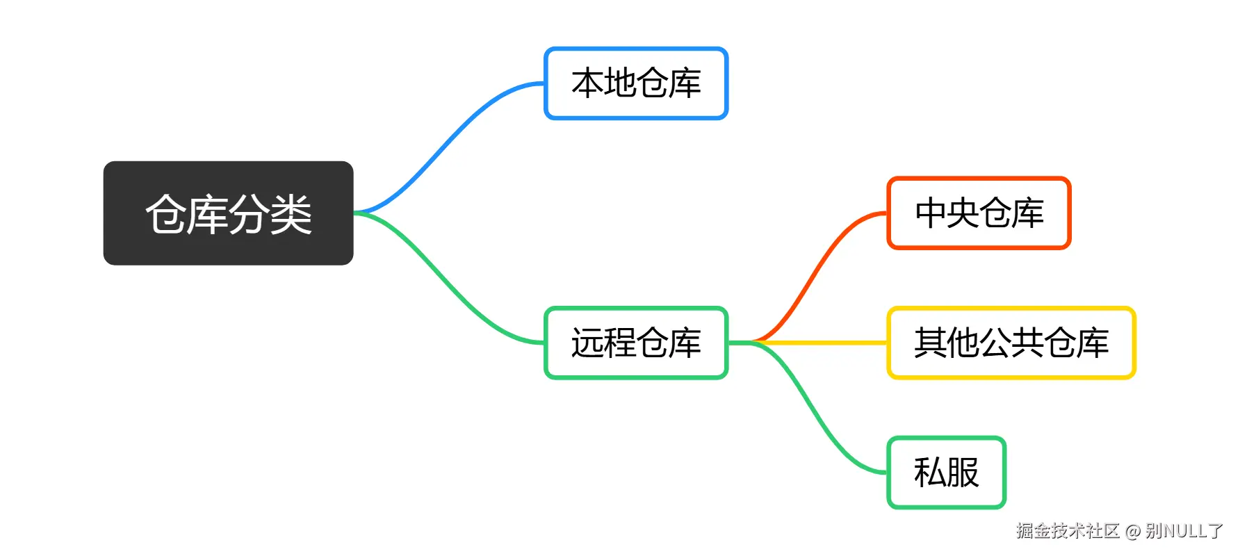 对于 Maven 来说,仓库种类可以分为两种,一种是本地仓库 ,另一种是远程仓库。而在远程仓库当中,又可以分为中央仓库,私服和其他的公共仓库。