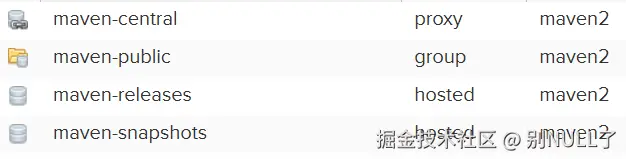 | maven-public | Nexus 默认创建,供开发人员下载使用的组仓库 |
