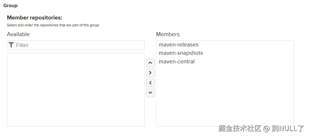 下图是nexus默认仓库maven-public的部分配置,表示将maven-releases、maven-snapshots、maven-central设置为group仓库的成员。所以maven中只需要配置nexus的maven-public仓库就相当于配置了三个仓库。