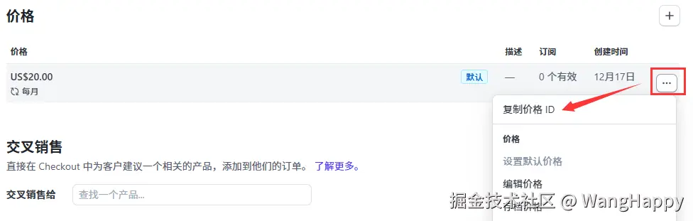 priceId的获取方法: 进入Stripe Dashboard 产品目录 点击已创建好的产品,进入详情页,找到价格,点击后面更多按钮,找到 复制价格ID,点击复制粘贴即可。