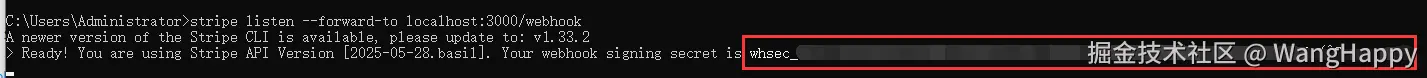 然后返回终端,再执行 stripe listen --forward-to localhost:3000/webhook。