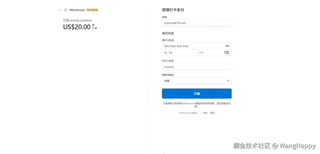 我们继续在右侧输入邮箱、测试卡号、持卡人姓名、国家或地区等信息,点击 订阅 。