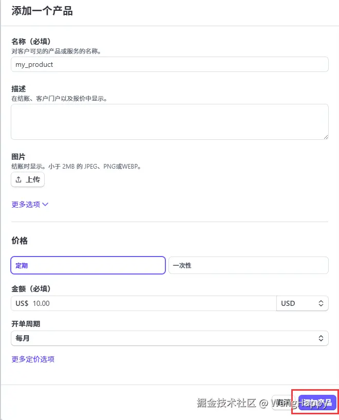 在前端调用接口之前,我们先登录 Stripe,在 Dashboard 中创建一个商品,参考下图: