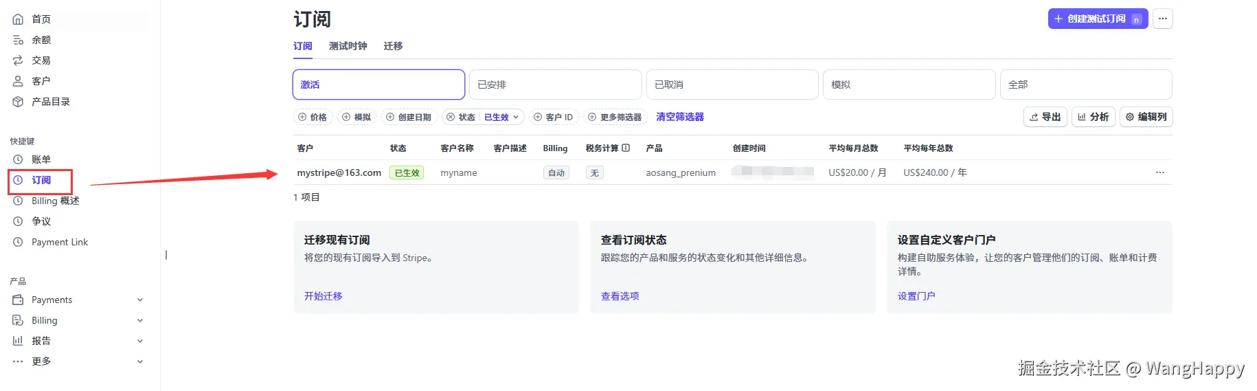 此时,我们回到 Stripe Dashboard,打开左侧 订阅 选项,可以看到已经成功获取到了订阅的用户信息。