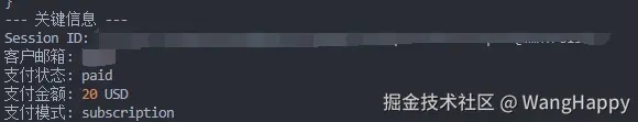 可以看到控制台获取到了 Webhook 监听的支付成功的信息,以下是 Webhook 监听支付的几种常用状态: