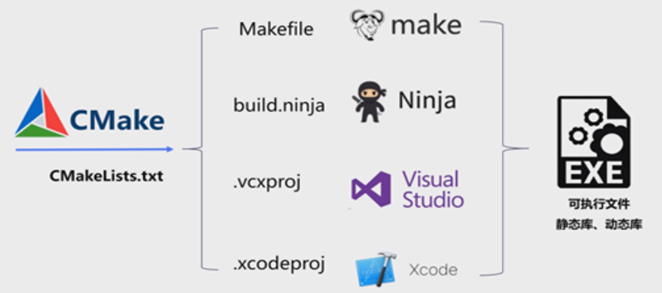CMake根据CMakeLists.txt文件,将源文件 编译成MakeFile,build.ninja, .vcxproj, .xcodeproj等,然后再生成可执行文件/静态库/动态库。
