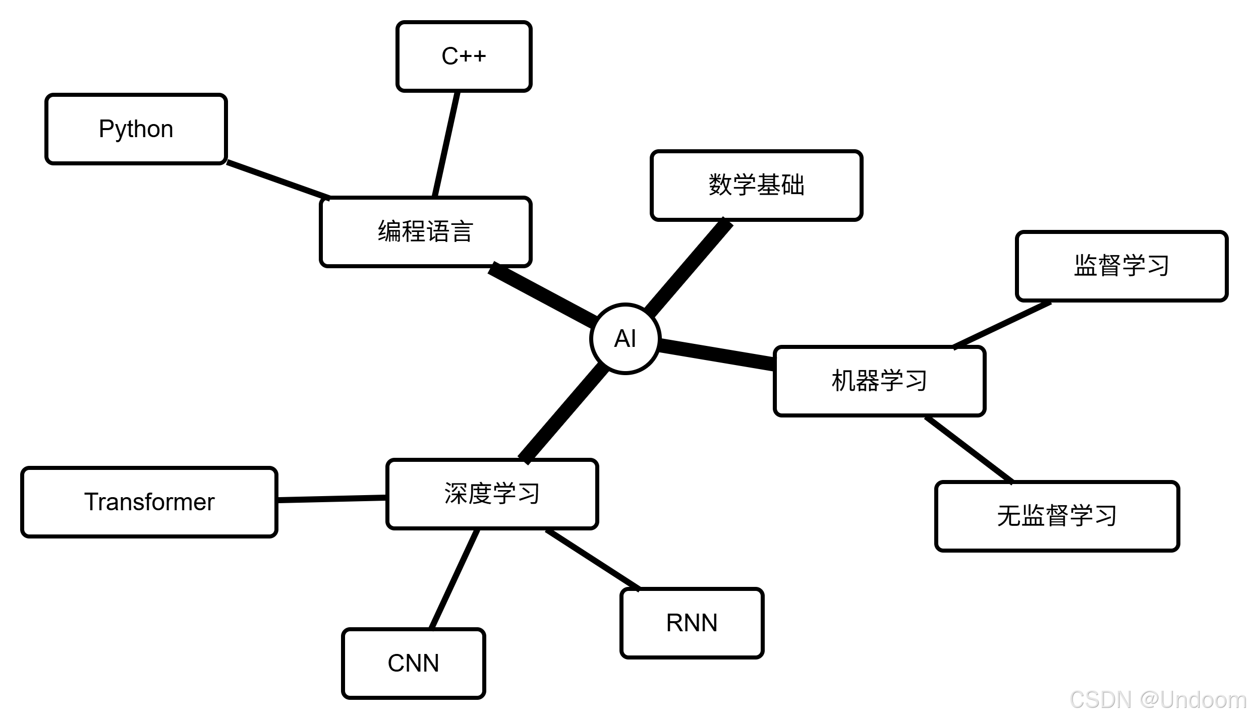 输入指令:中心节点 AI,分支包含机器学习、深度学习、编程语言、数学基础及其子节点。