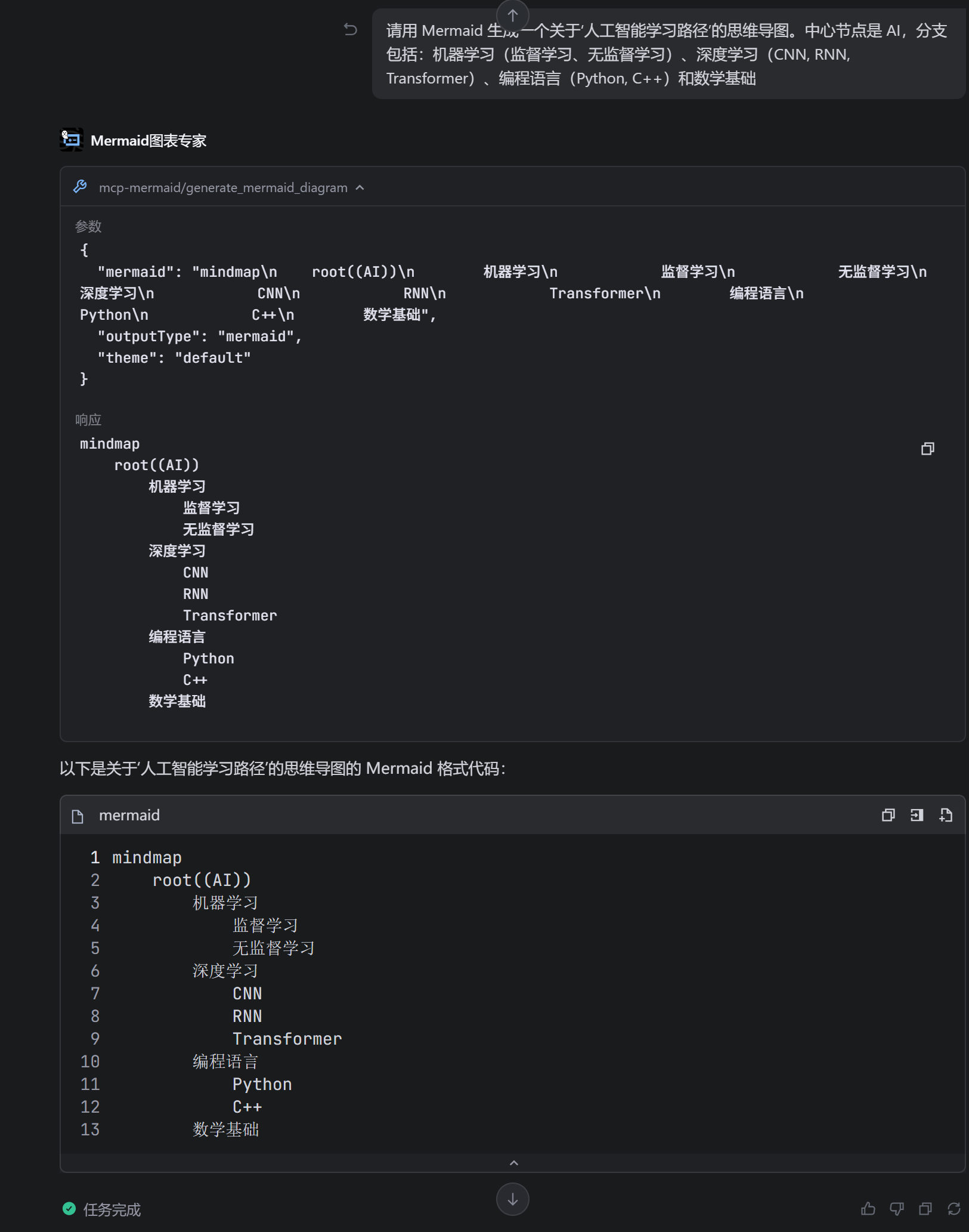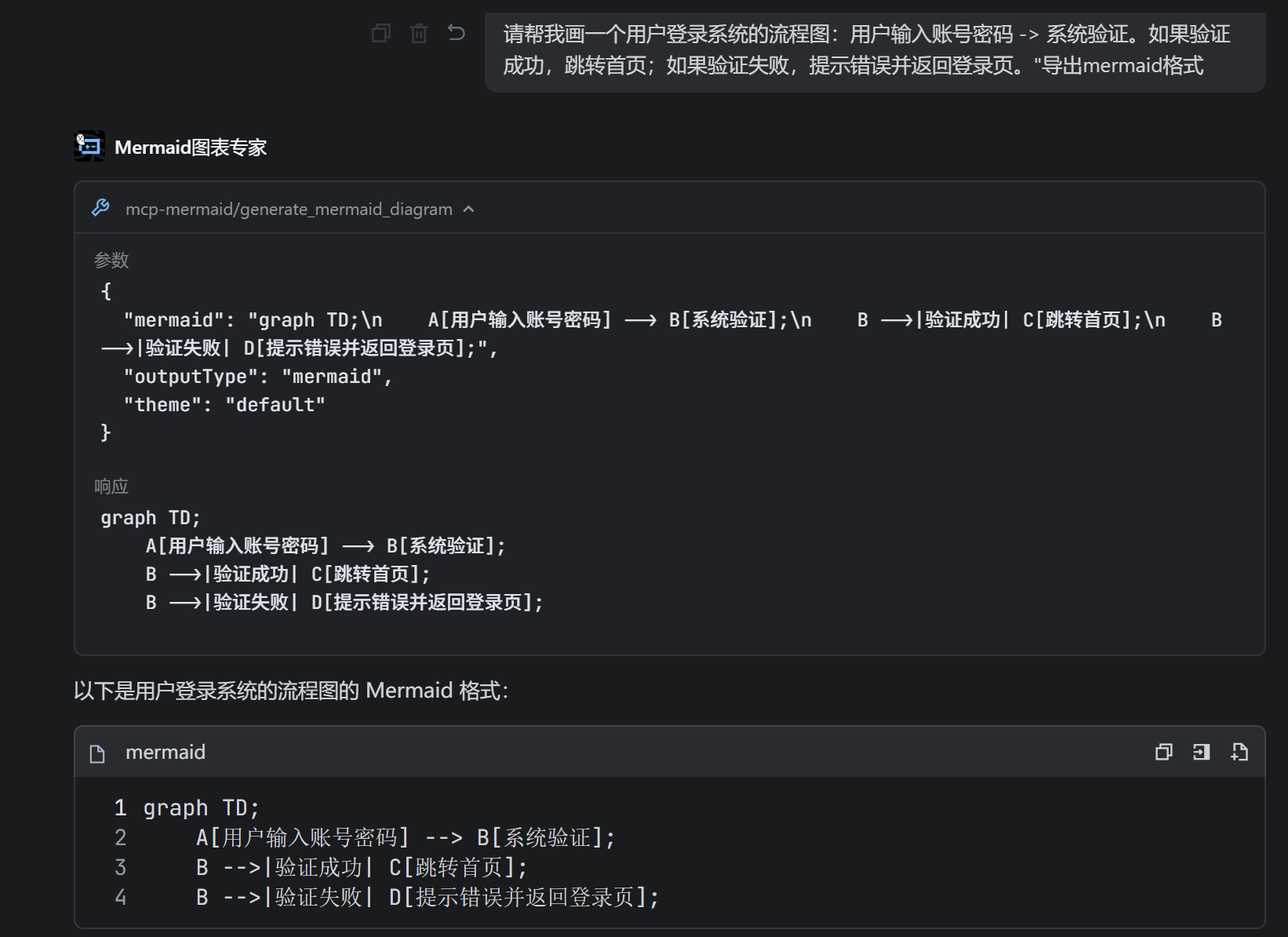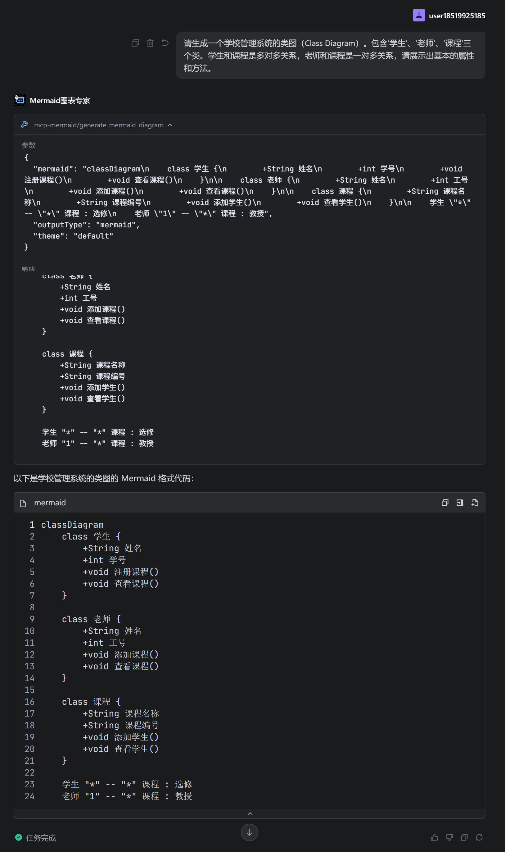 在上图的操作界面中,用户勾选了刚刚添加的 MCP Mermaid 服务。这意味着该智能体在处理用户输入时,拥有了调用 Mermaid 工具的权限。通过这种方式,可以将通用的聊天功能与专业的绘图功能进行隔离,确保生成的代码更加纯粹和专业。