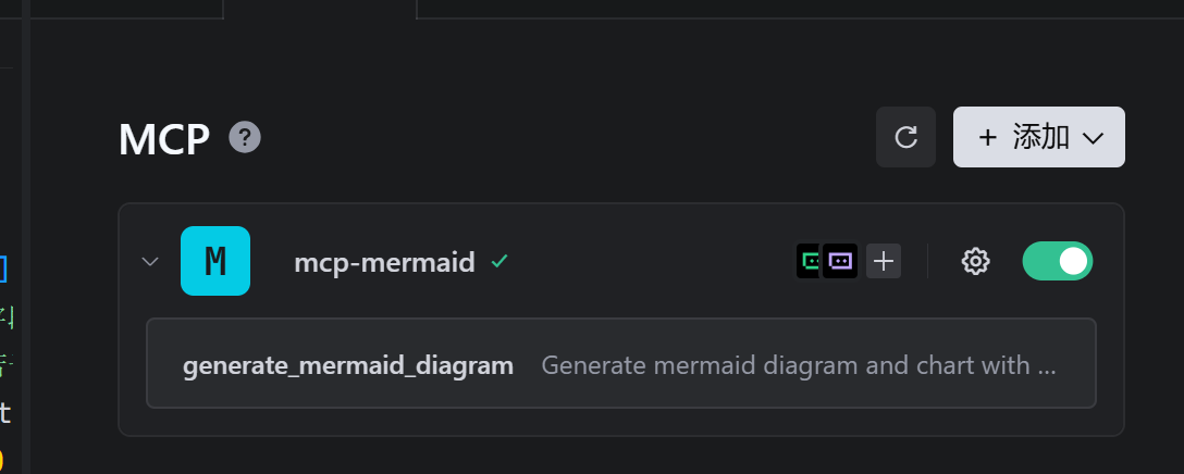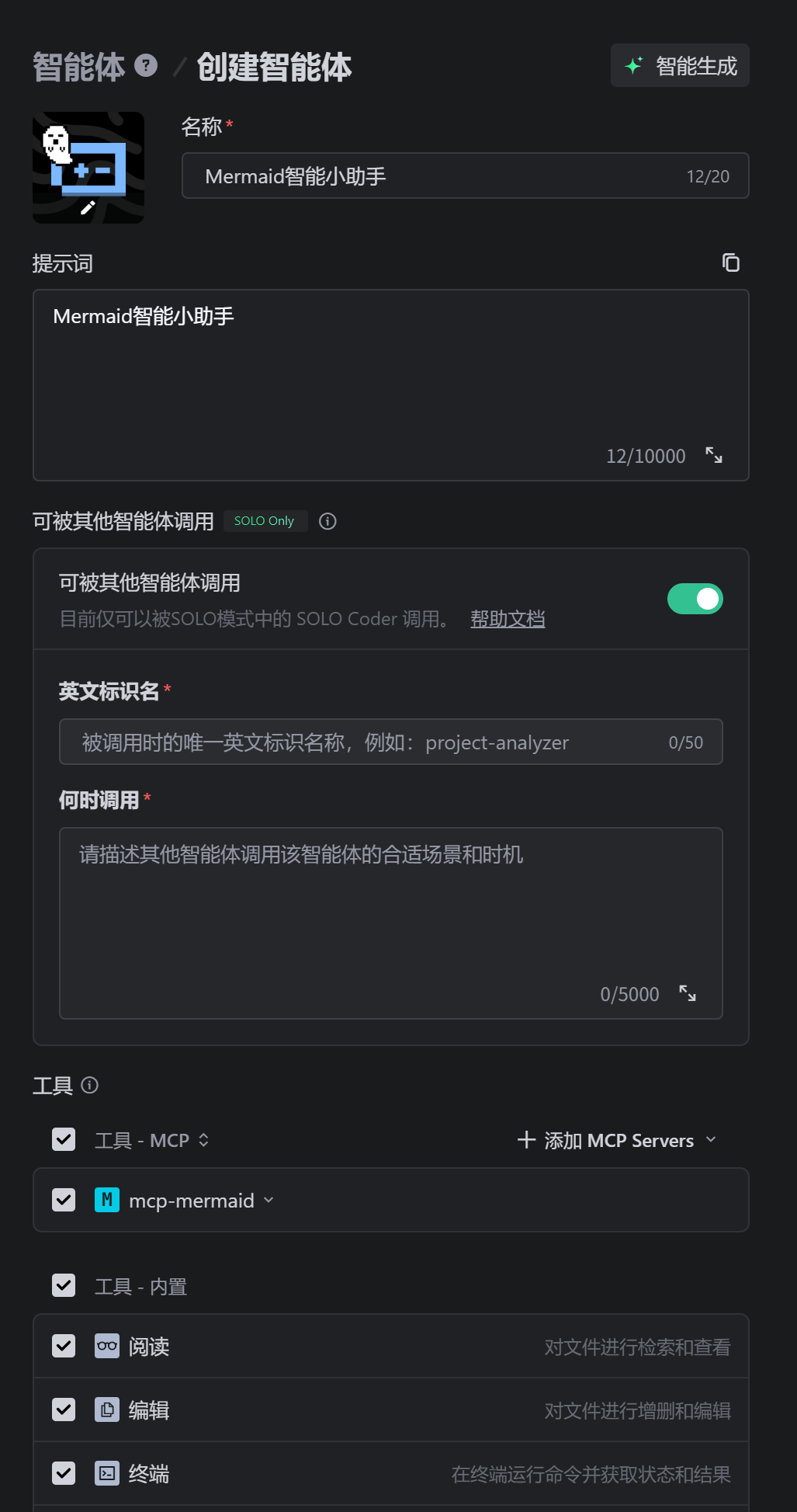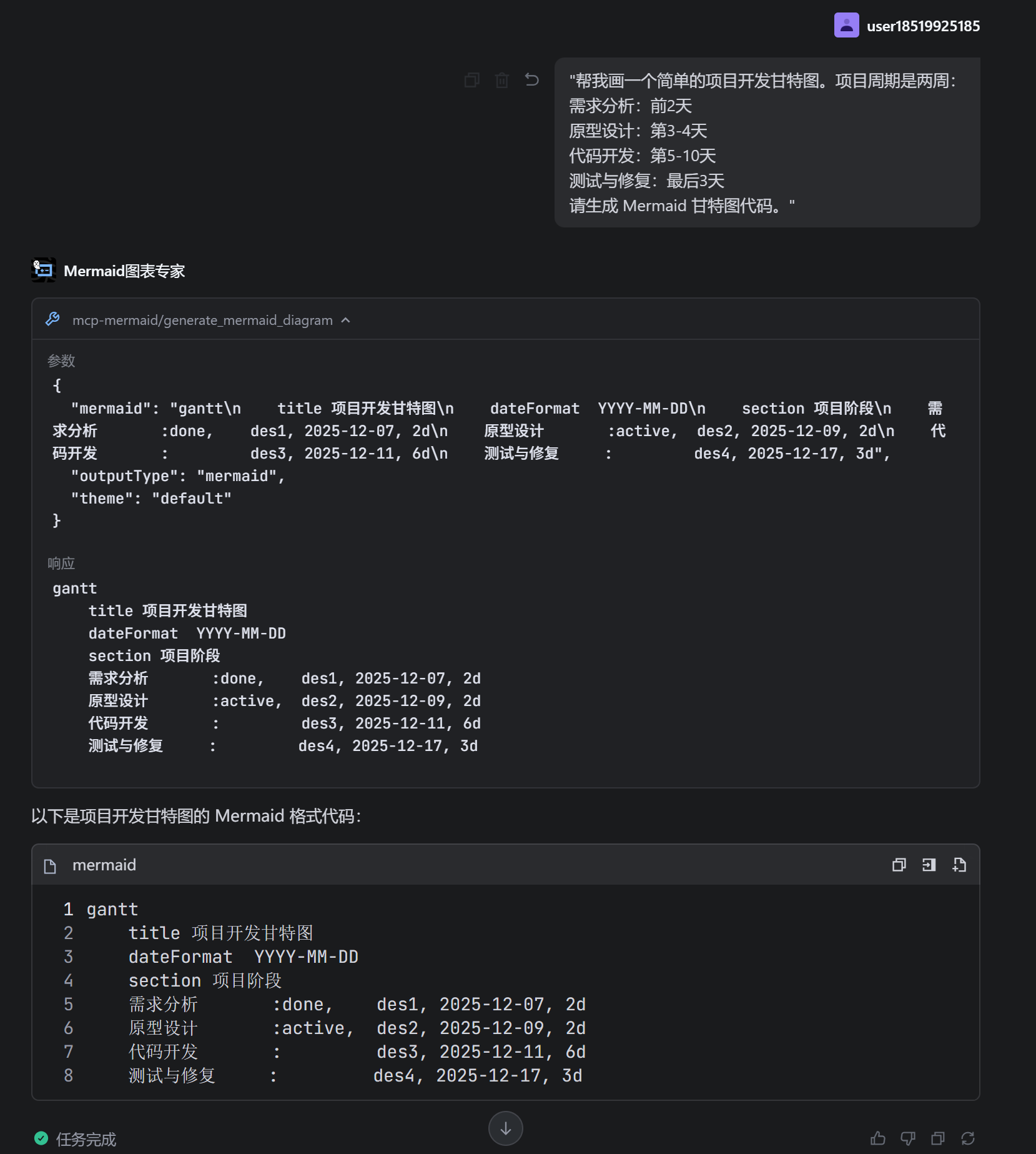 在上图的操作界面中,用户勾选了刚刚添加的 MCP Mermaid 服务。这意味着该智能体在处理用户输入时,拥有了调用 Mermaid 工具的权限。通过这种方式,可以将通用的聊天功能与专业的绘图功能进行隔离,确保生成的代码更加纯粹和专业。