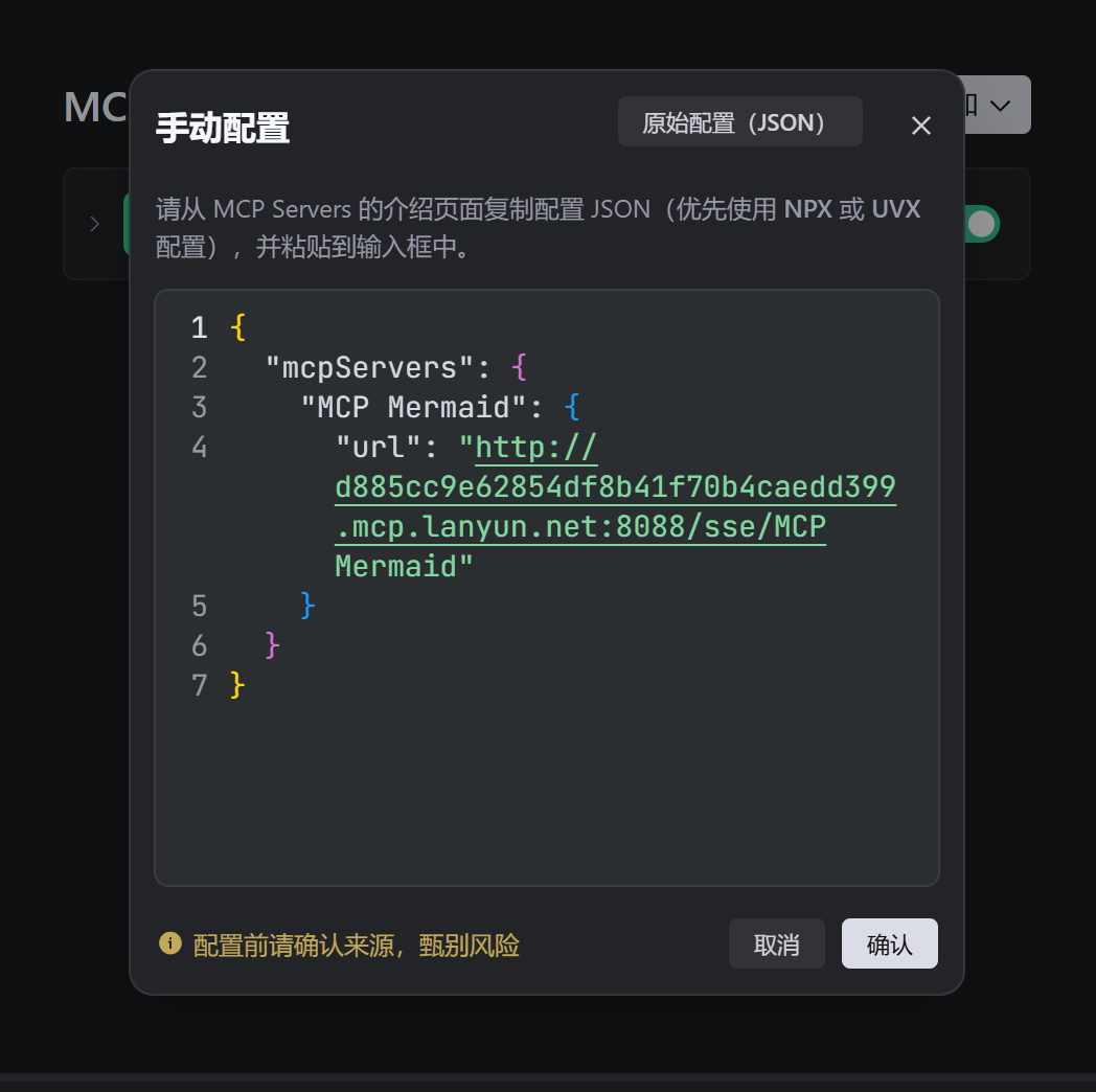 "url": "http://d885cc9e62854df8b41f70b4caedd399.mcp.lanyun.net:8088/sse/MCP Mermaid"