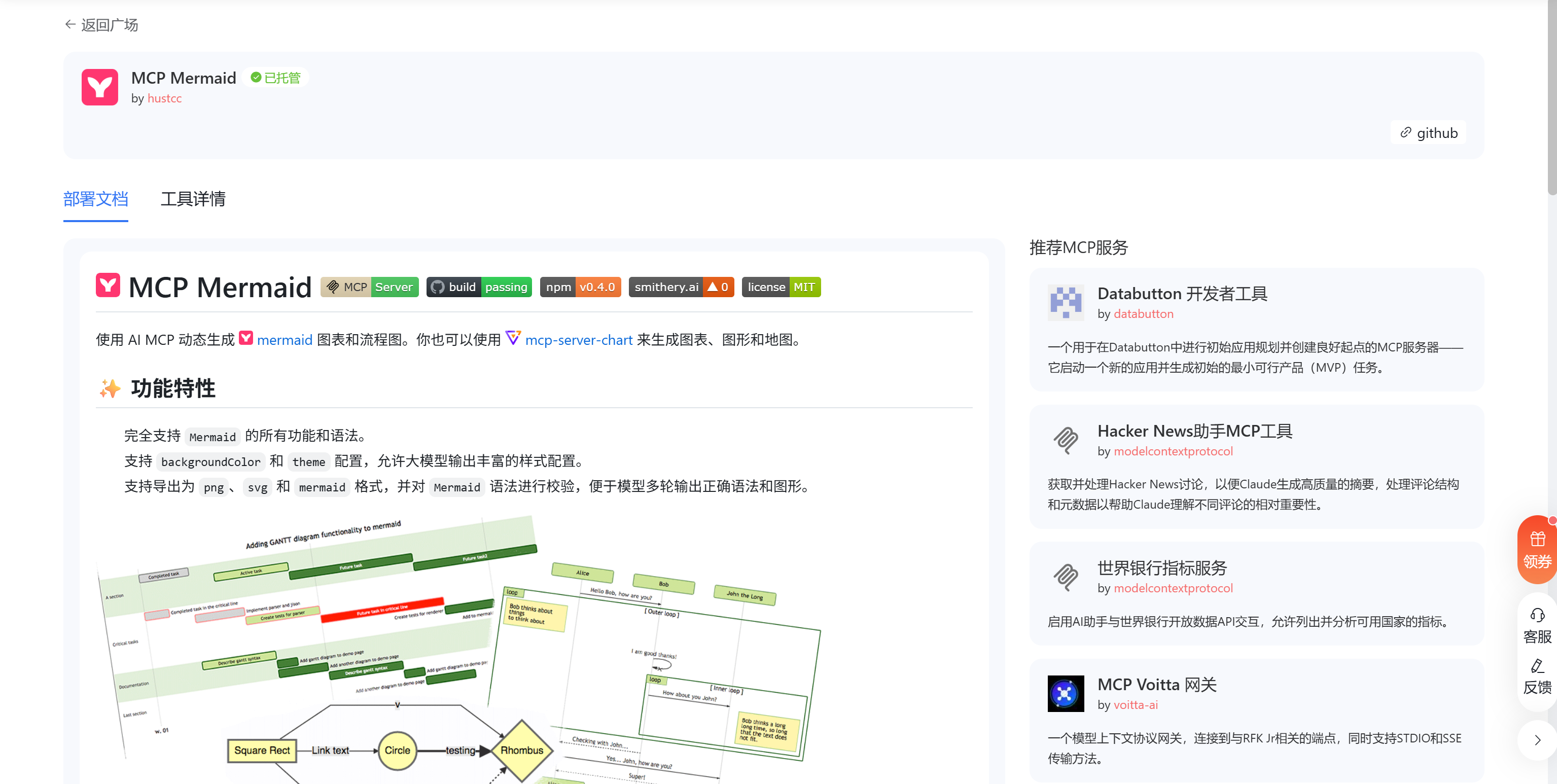 上图展示了搜索结果页面。可以看到界面中央清晰地列出了搜索到的 MCP Mermaid 卡片。这一步是整个流程的起点,意味着我们不仅仅是在寻找一个绘图工具,而是在寻找一个可以被 AI 调用的标准接口(Interface)。该卡片不仅显示了名称,通常还会包含该工具的版本信息、简要描述以及部署状态。