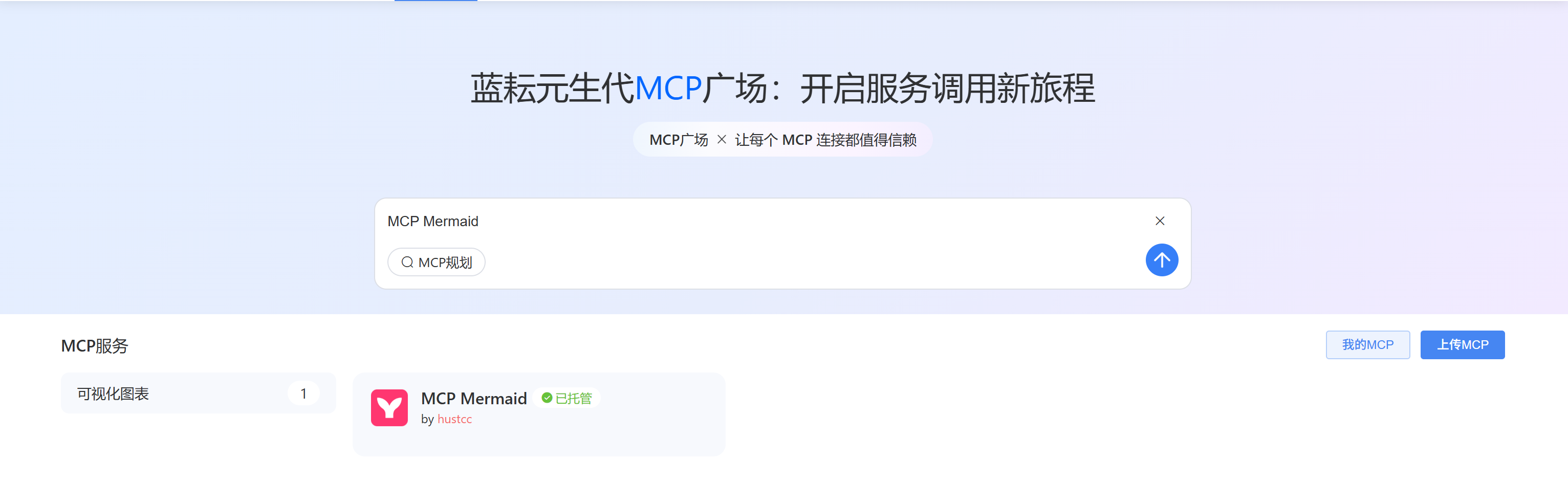 在蓝耘 MCP 广场的搜索界面,通过输入关键词 MCP Mermaid,可以快速定位到目标工具。