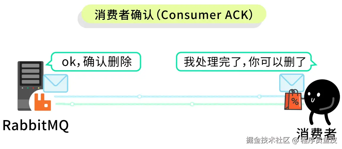 2)消费者确认(Consumer ACK):消费者处理消息成功后,要手动告诉 RabbitMQ "我处理完了,你可以删了"。