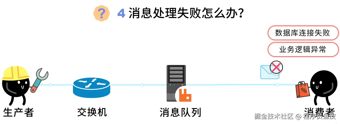 鱼皮:如果消费者处理消息时出错了,比如数据库连接失败、业务逻辑异常,怎么办呢?