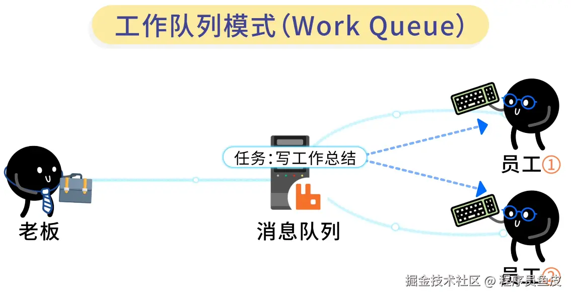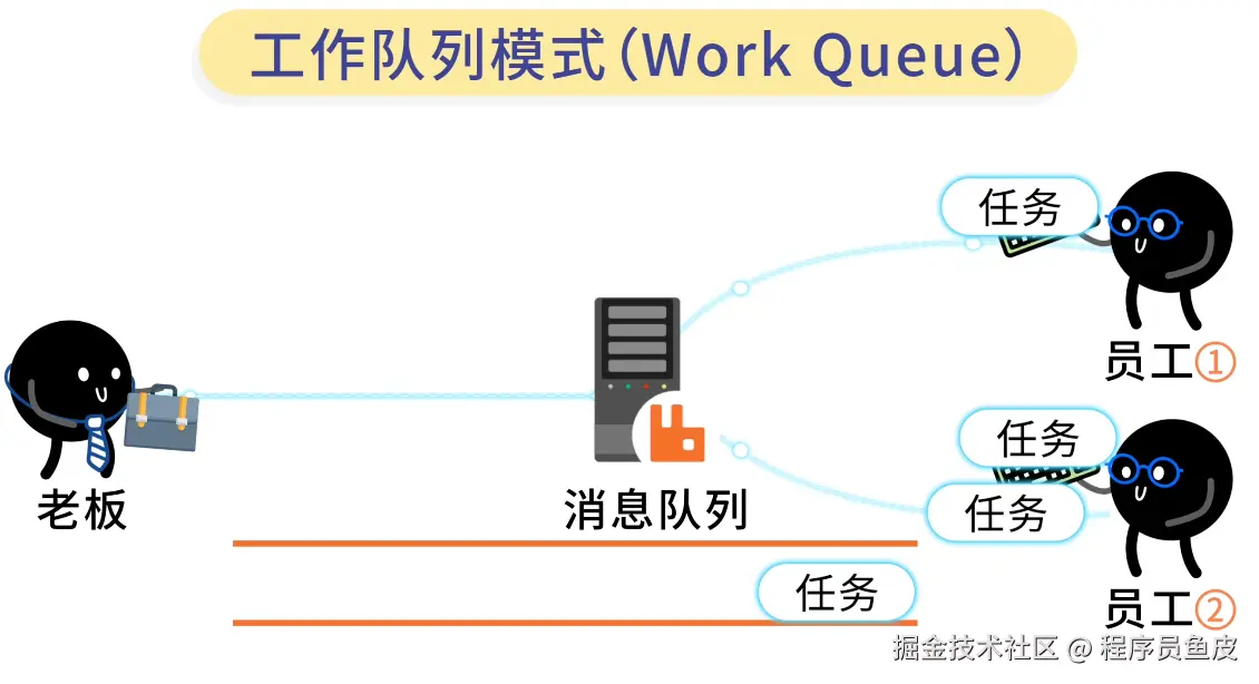 鱼皮:没错,这就是 Work Queue 工作队列模式,一个生产者、一个队列、多个消费者。