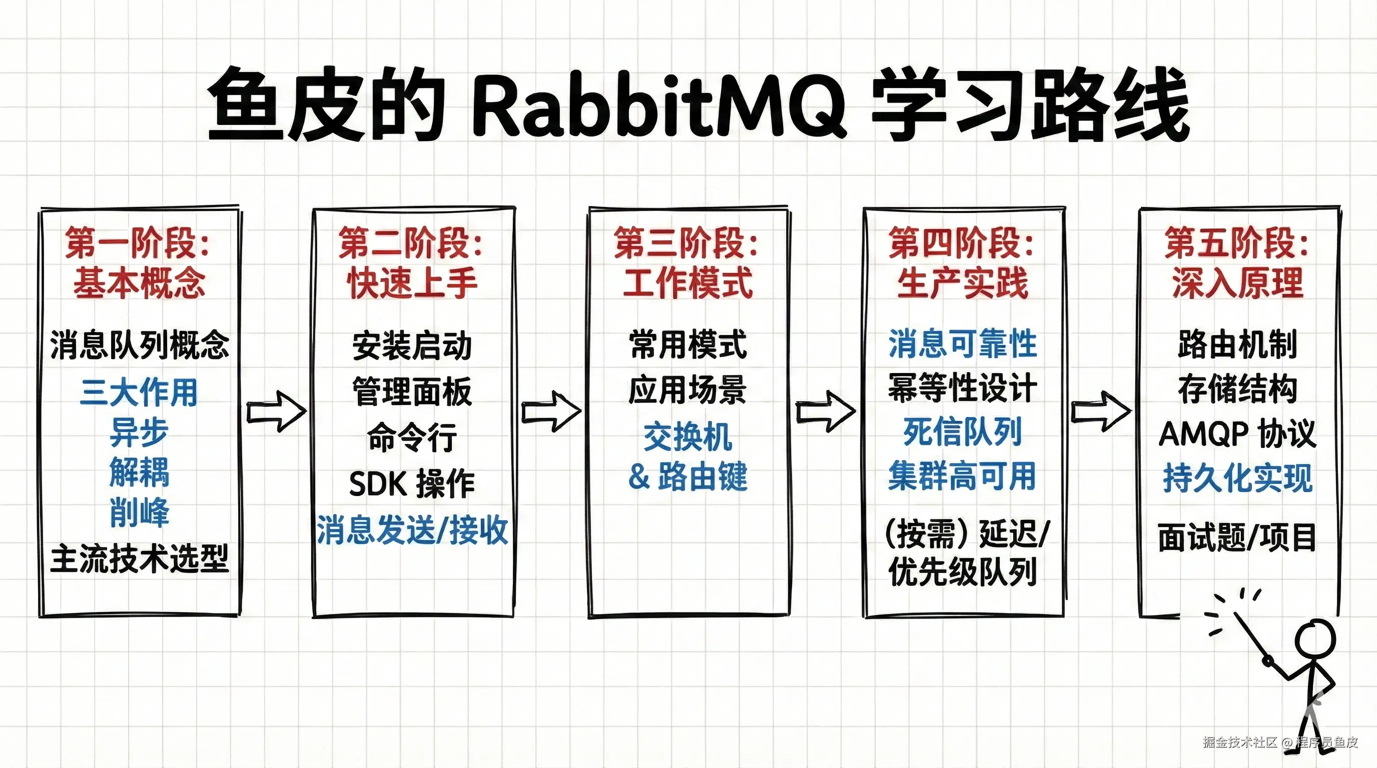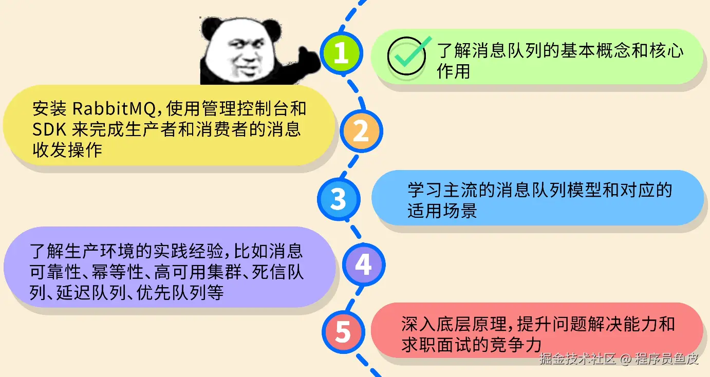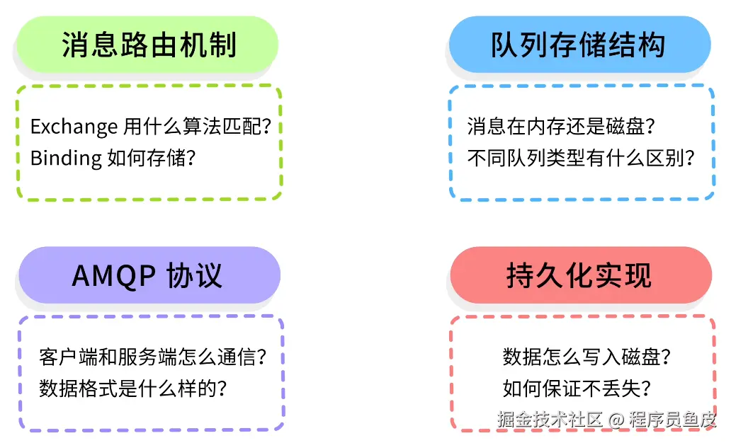鱼皮:阿坤你别逗他了,其实可以带着问题学习,重点探索 RabbitMQ 的消息路由机制、队列存储结构、AMQP 协议和消息持久化的实现。