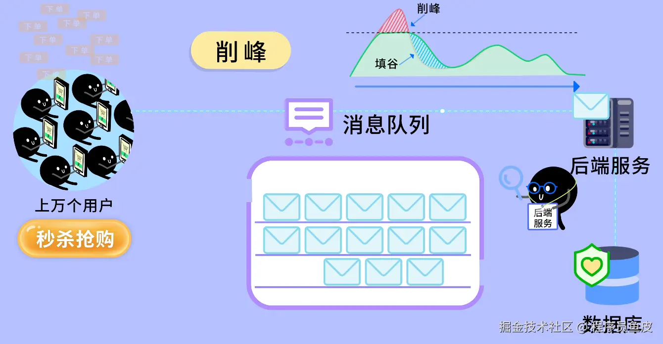 这就是 削峰:削平流量洪峰,保护后端系统不被压垮。