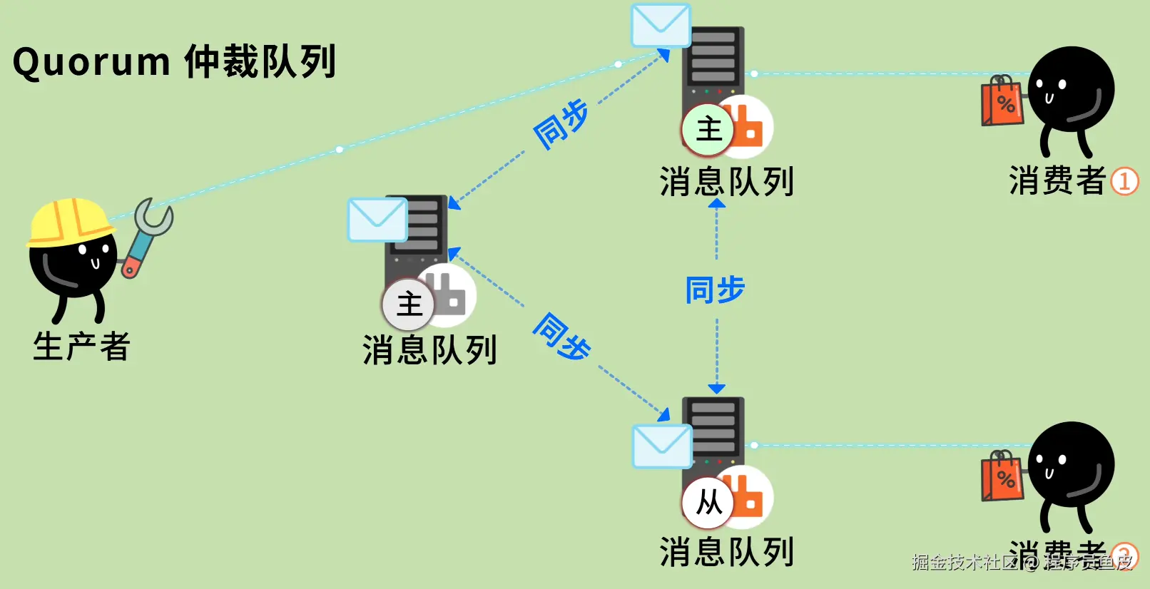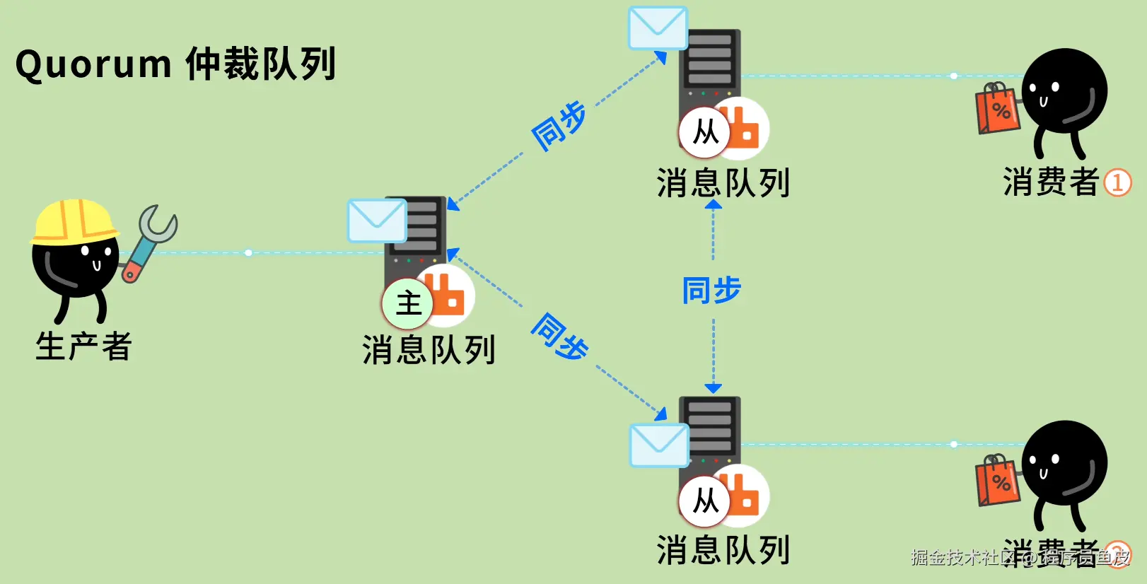 对于重要的队列,要使用 Quorum 仲裁队列,它基于 Raft 协议实现,会把数据自动同步到多个节点,保证数据一致性。