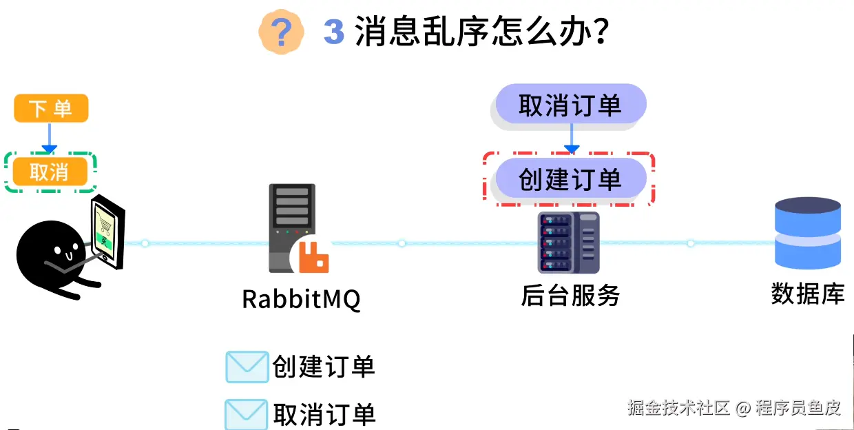 鱼皮:比如用户先抢购下单、然后取消订单,分别向队列发了 "创建订单" 和 "取消订单" 2 条消息。如果处理顺序乱了,系统先处理取消、后处理创建,订单状态就错了。