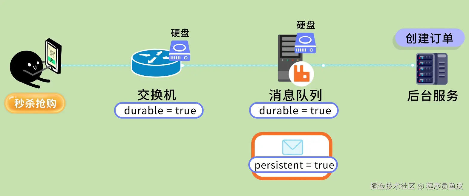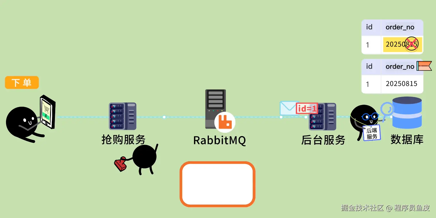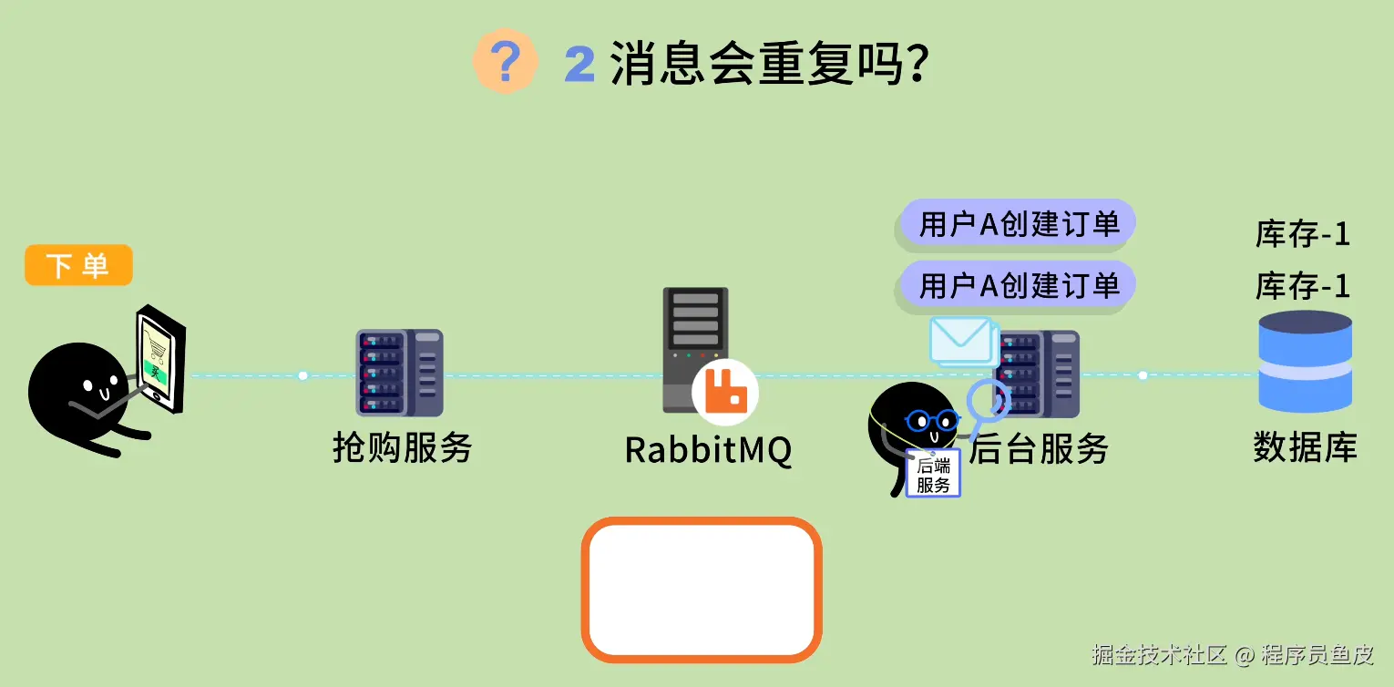 鱼皮:如果网络抖动,或者消费者重启,同一条消息可能被消费多次。比如抢购消息被重复消费,同一个用户的订单被创建了 2 次,库存被扣了 2 次怎么办?