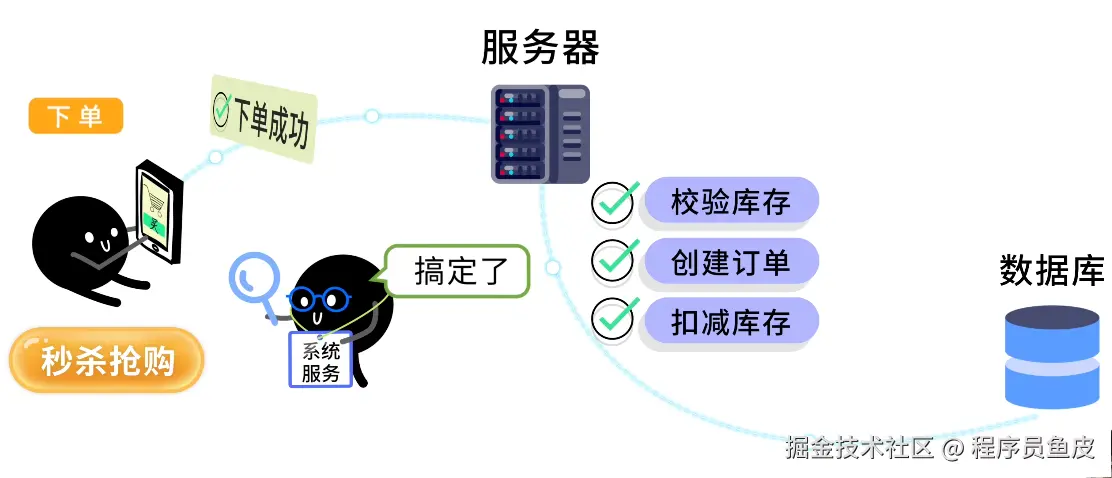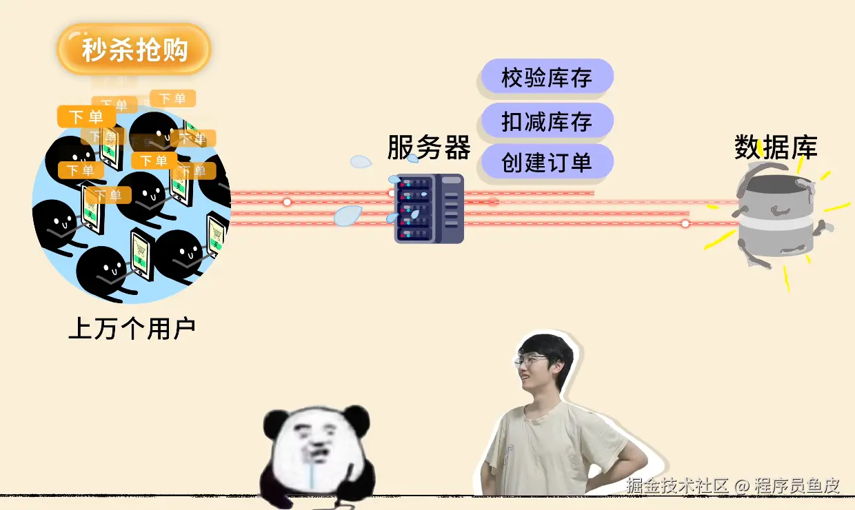 鱼皮看了看你的代码:用户每次抢购,你的代码都要同步处理校验库存、扣减库存并创建订单等多个操作。同时抢购的用户多了,系统就会压力山大。