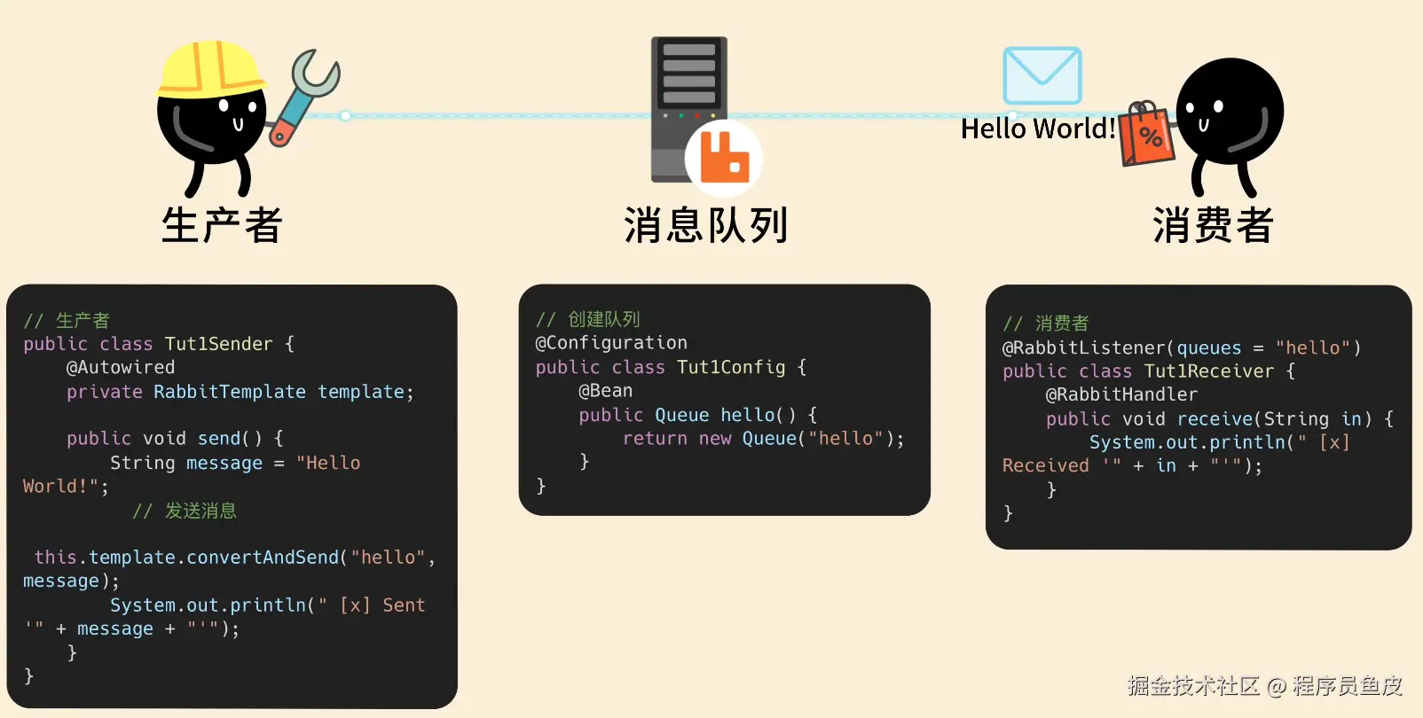 只需几行代码,就能创建队列、让生产者发送消息、让消费者接收处理消息: