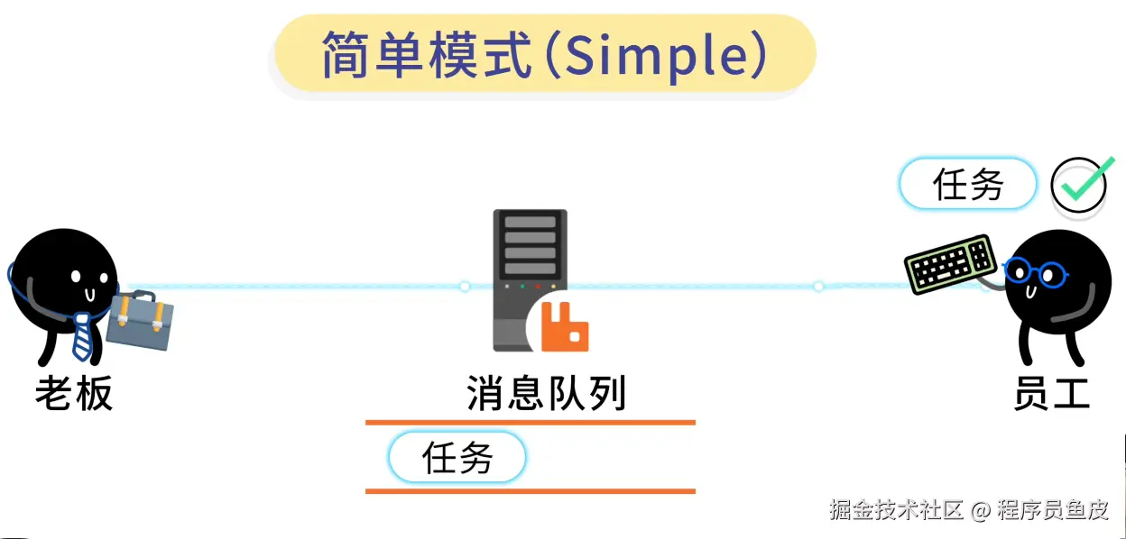 最简单的是 Simple 模式,一个生产者、一个队列、一个消费者。