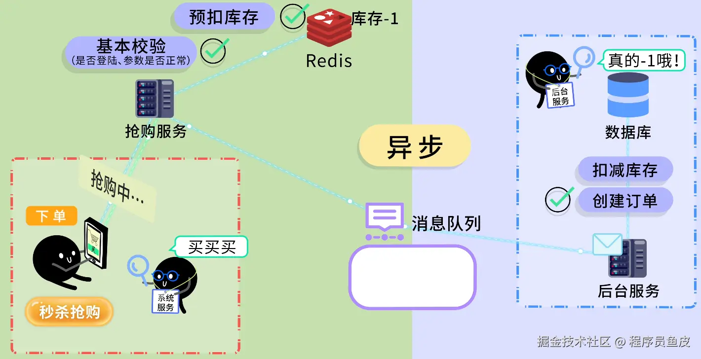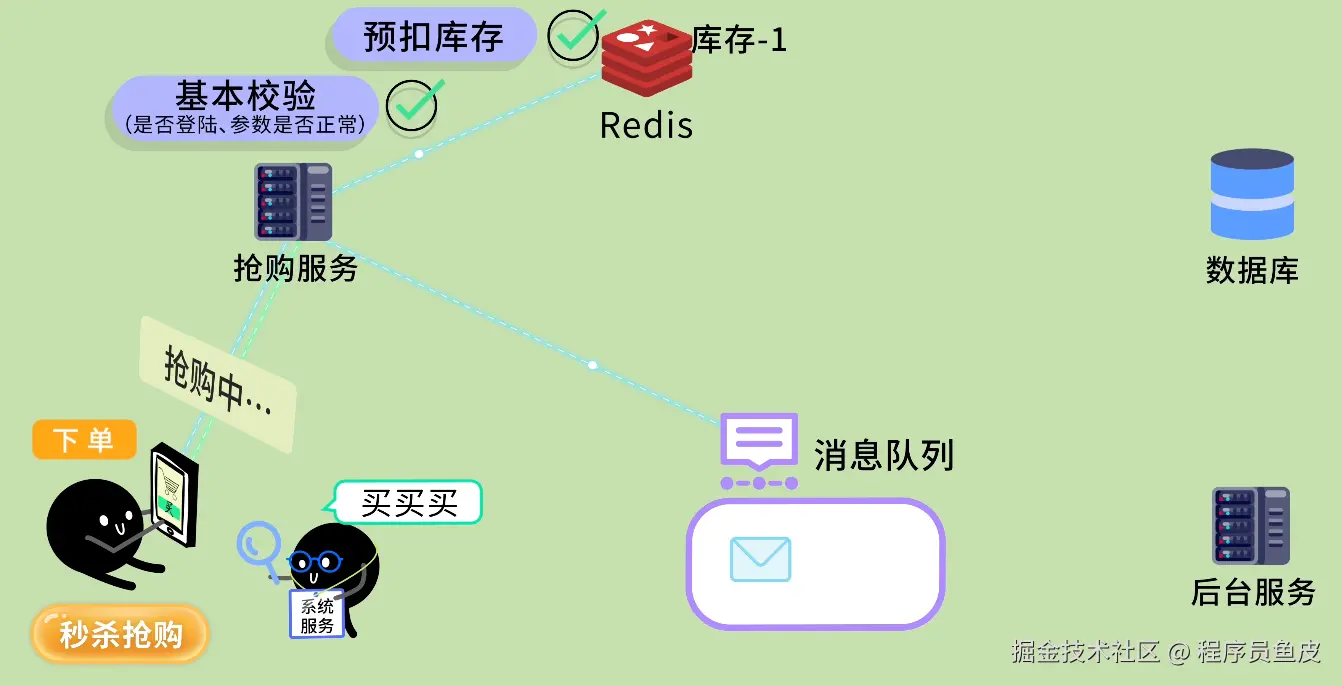 接下来由后台服务从队列中取出消息并处理那些耗时的操作,比如创建订单、在数据库中真正扣减库存。