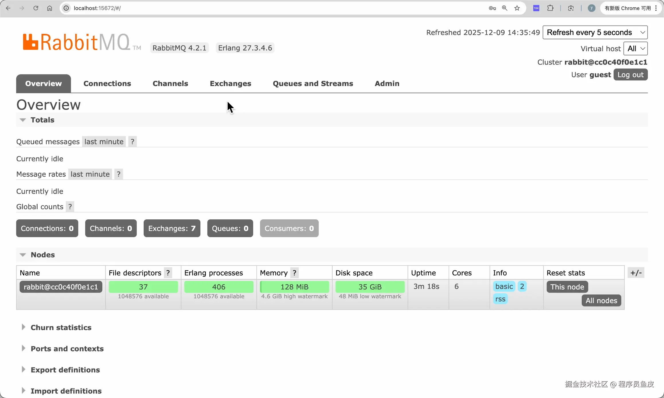 安装完之后,访问 http://localhost:15672 就可以打开 RabbitMQ 内置的可视化管理界面(默认用户名和密码都是 guest),你可以在这里查看队列的运行情况、手动发送和接收消息。