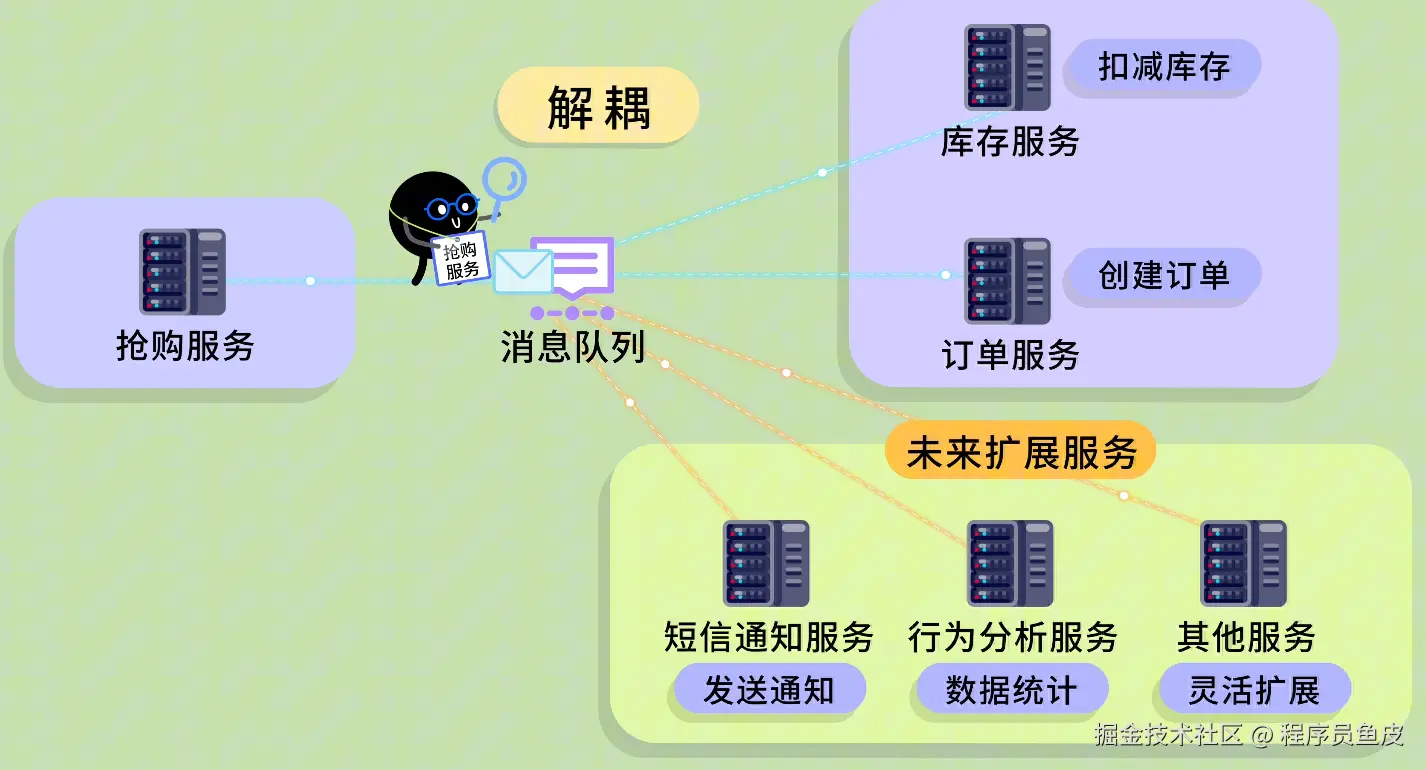 这就是 解耦:服务之间不直接依赖,让系统能灵活扩展。
