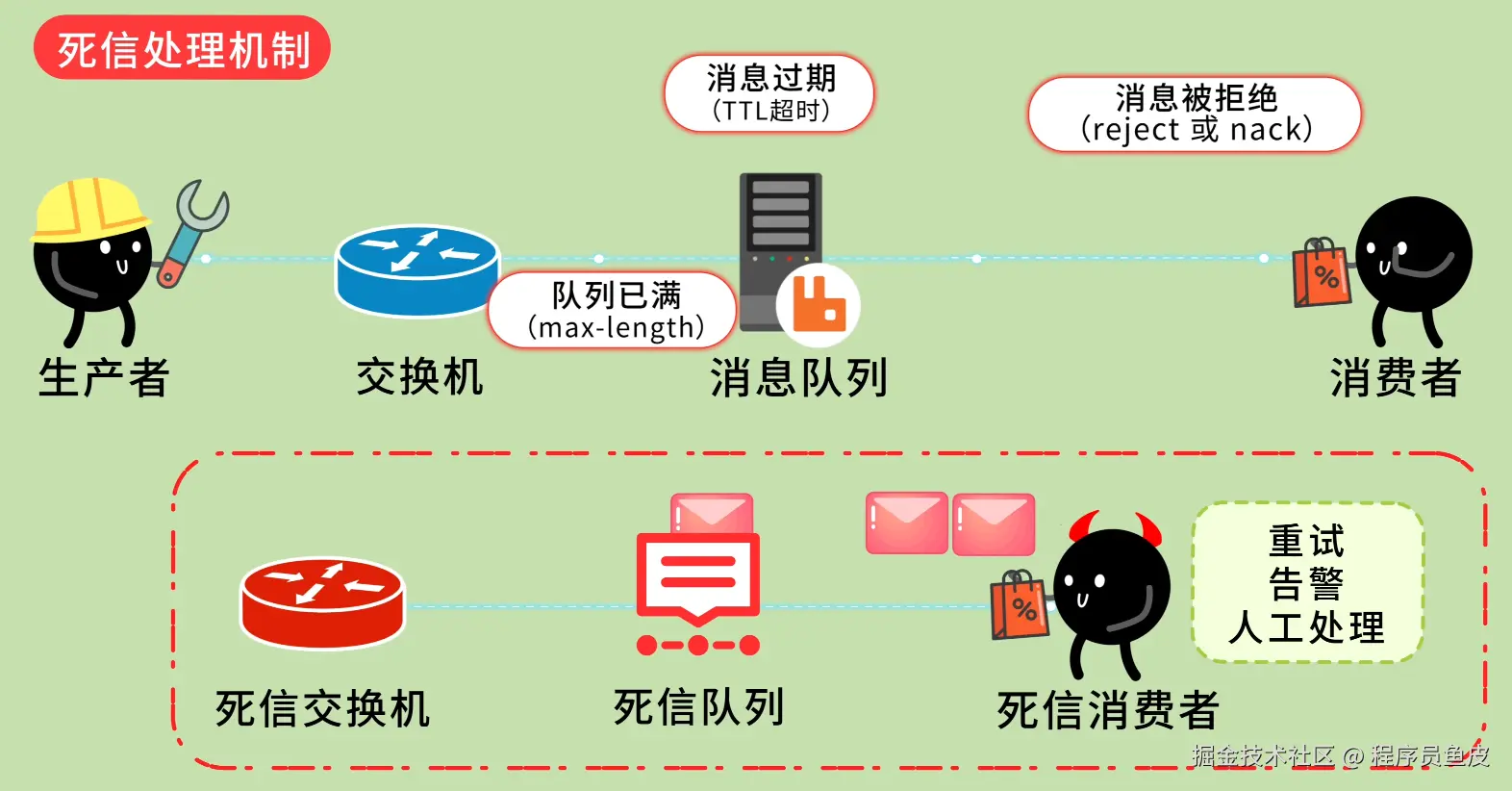 鱼皮:没错,我们要给死信一个去处。可以配置死信交换机(DLX),将死信自动路由到死信队列。由专门的消费者监控死信队列,发现死信后,可以重试、告警、或者人工处理。