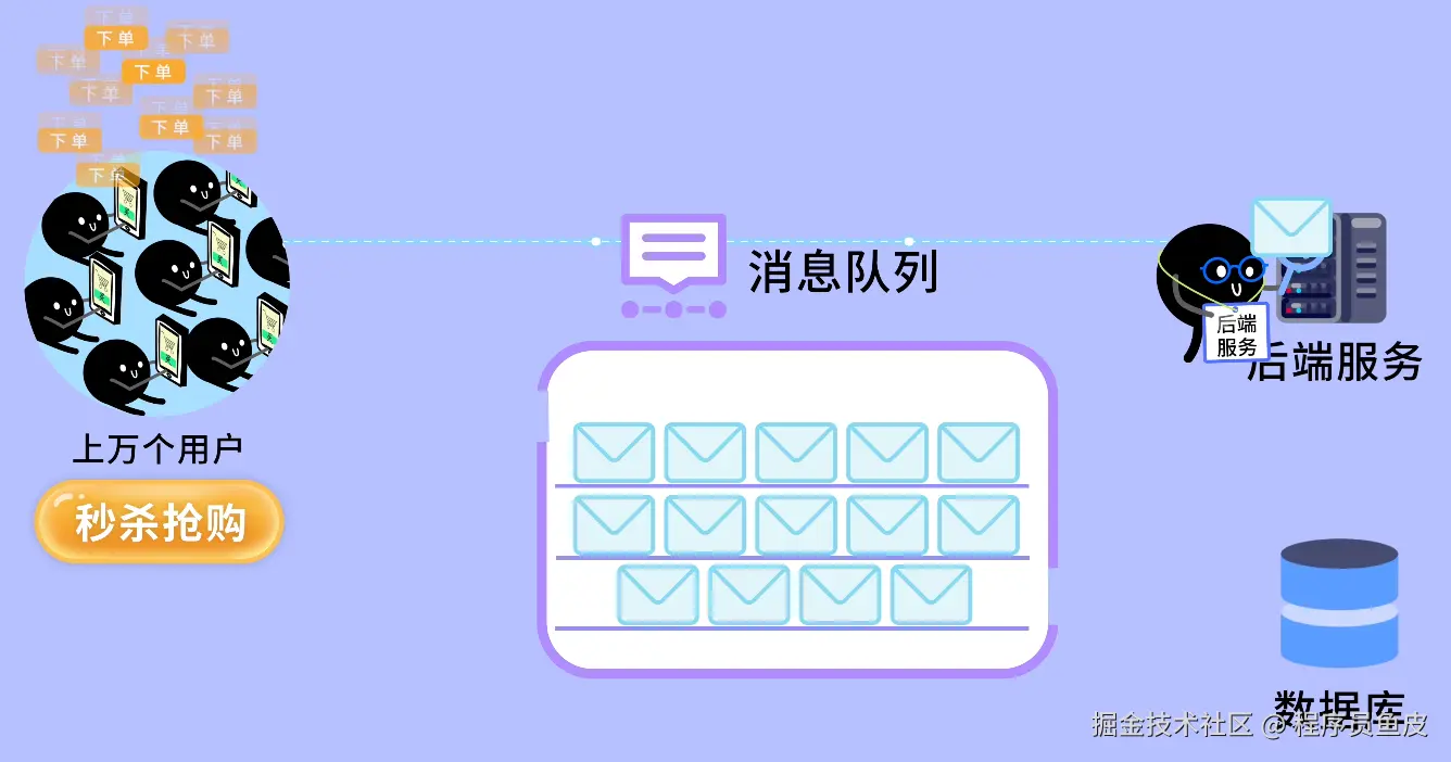 如果同时抢购的用户过多,数据库处理不过来,也可以用消息队列做缓冲。所有的抢购请求先快速存入队列,后台服务可以根据自己的能力从队列中慢慢拉取消息并进行处理。
