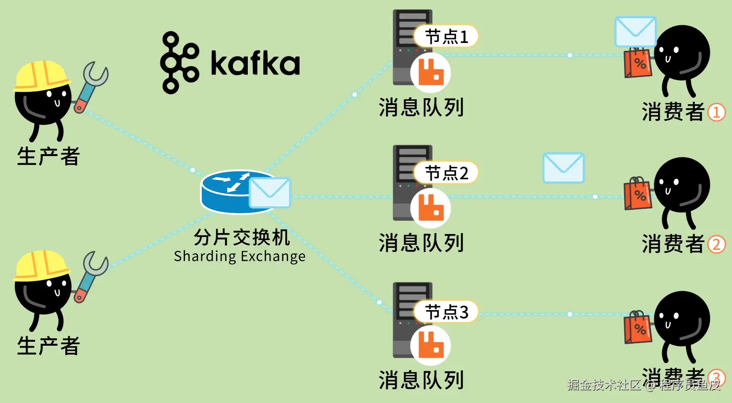 鱼皮:好问题!之前工作队列是多个员工共享一个任务列表,而现在每个员工都要有自己的任务队列。
