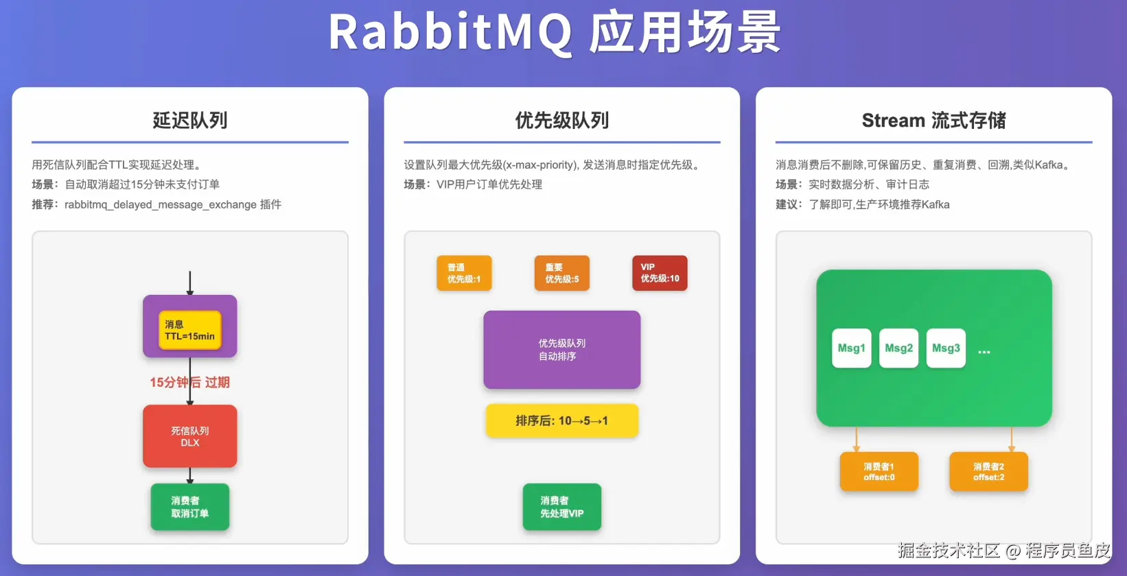 鱼皮:单队列内确实有序,但如果你开了多个消费者并发处理,可能消息 1 还在处理,消息 2 已经处理完了,顺序就乱了。