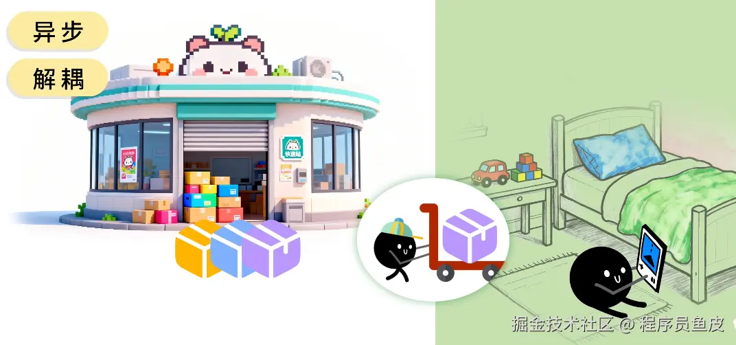 鱼皮:消息队列(俗称 MQ)就像一个快递驿站。快递员作为 生产者 ,把包裹(消息)放到驿站(消息队列),收件人作为 消费者,自己到驿站去取。