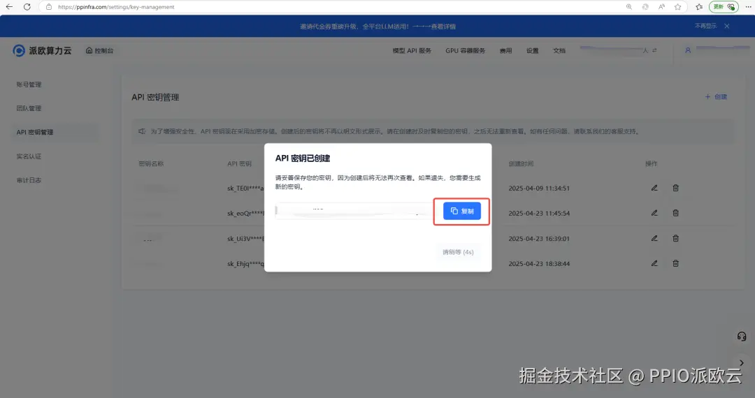 注册并登录 PPIO,然后打开 API 密钥管理页面,点击【创建】按钮,输入自定义密钥名称,生成 API 密钥。