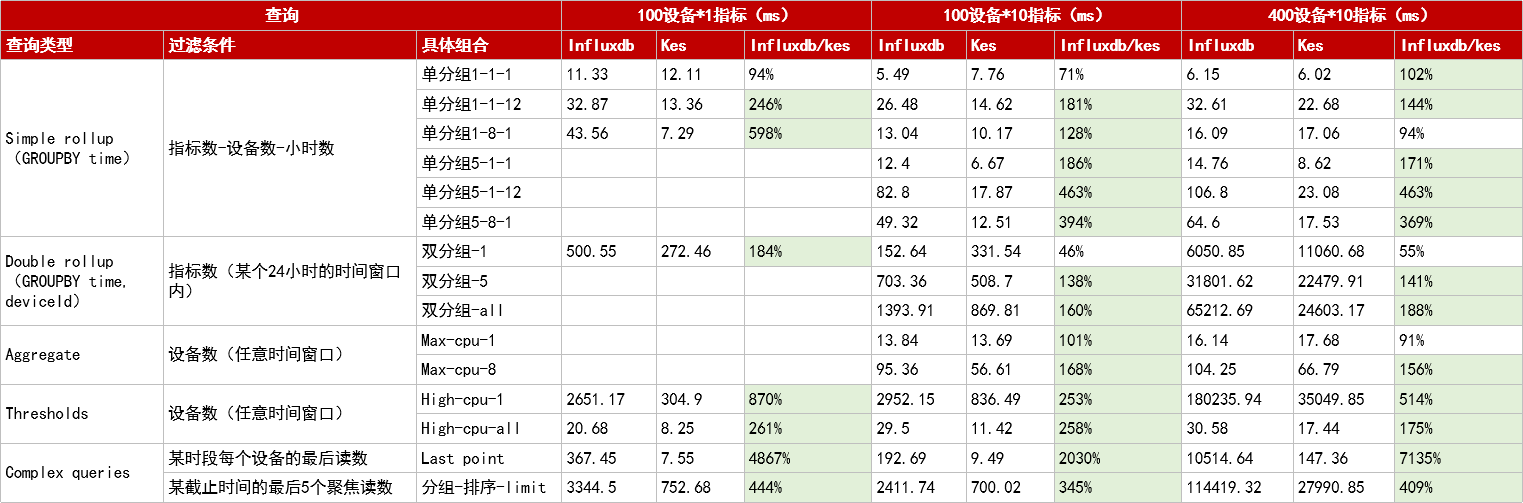 - 高复杂度分析查询 (如 Last point 查询、阈值筛选):金仓性能更是呈现数量级领先。例如,查询 400 台设备的"最后读数"场景中,金仓耗时仅为 147.36 毫秒,而 InfluxDB 需要 10514.64 毫秒,性能领先超过70 倍。