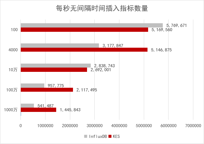 测试模拟了从 100 台到 1000 万台设备的数据写入压力。当设备数达到 4000 台(每台 10 个指标)时,金仓的每秒数据插入指标数已是 InfluxDB 的162% ;在千万级设备的极限压力测试中,性能优势进一步扩大至267%。这说明金仓在高并发持续写入场景下,具备更强的扩展性和稳定性。