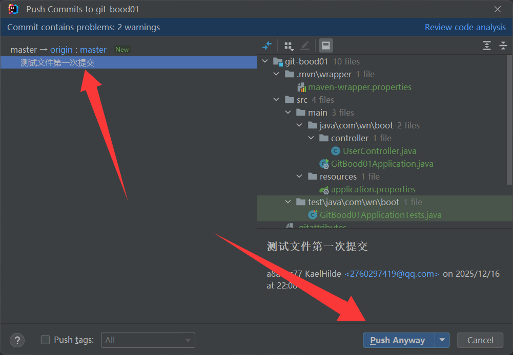 勾选上传至云端的文件及代码,选择好后在下面的框中编写提示信息比如"xxx文件xxx次提交",点击commit后点commit and push